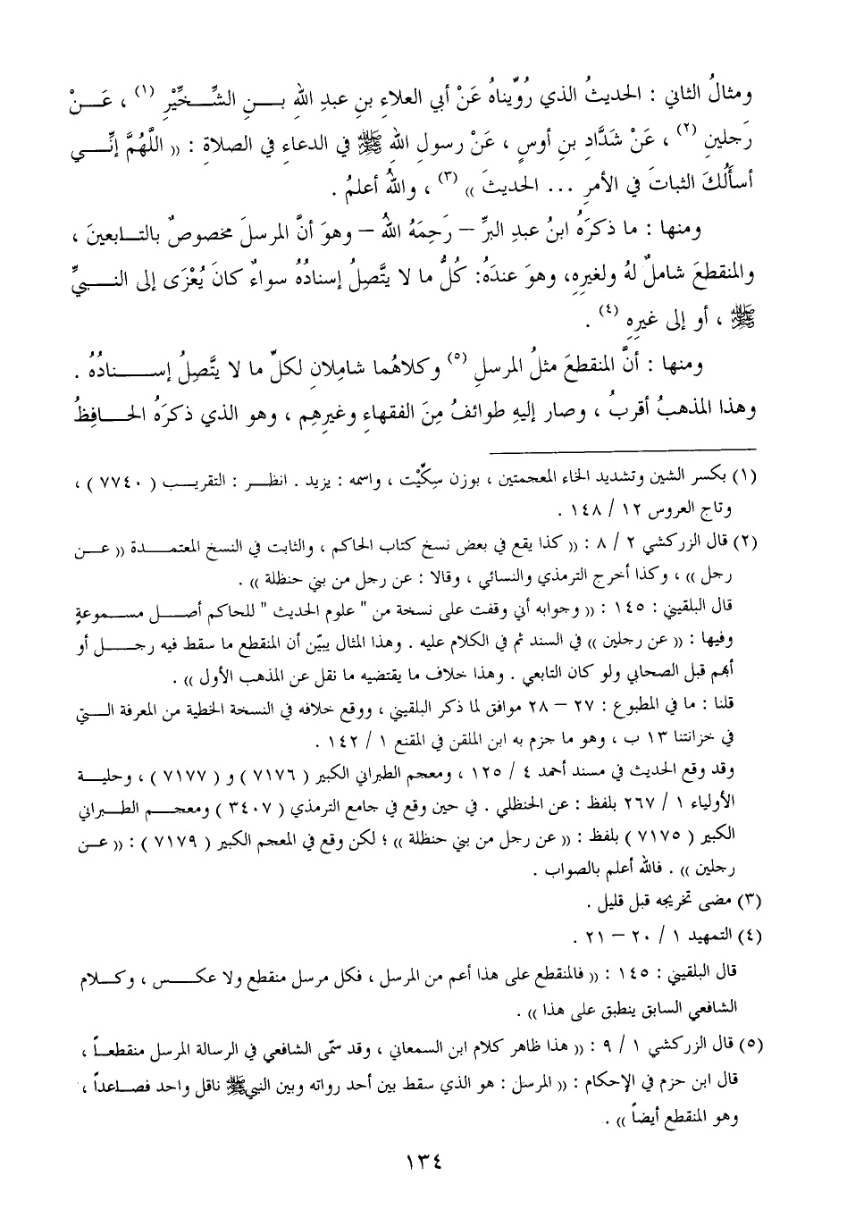 قال البلقيني: 145: ((وجوابه أني وقفت على نسخة من " علوم الحديث " للحاكم أصل مسموعةٍ وفيها: ((عن رجلين)) في السند ثم في الكلام عليه. وهذا المثال يبيّن أن المنقطع ما سقط فيه رجل أو أبهم قبل الصحابي ولو كان التابعي. وهذا خلاف ما يقتضيه ما نقل عن المذهب الأول)).