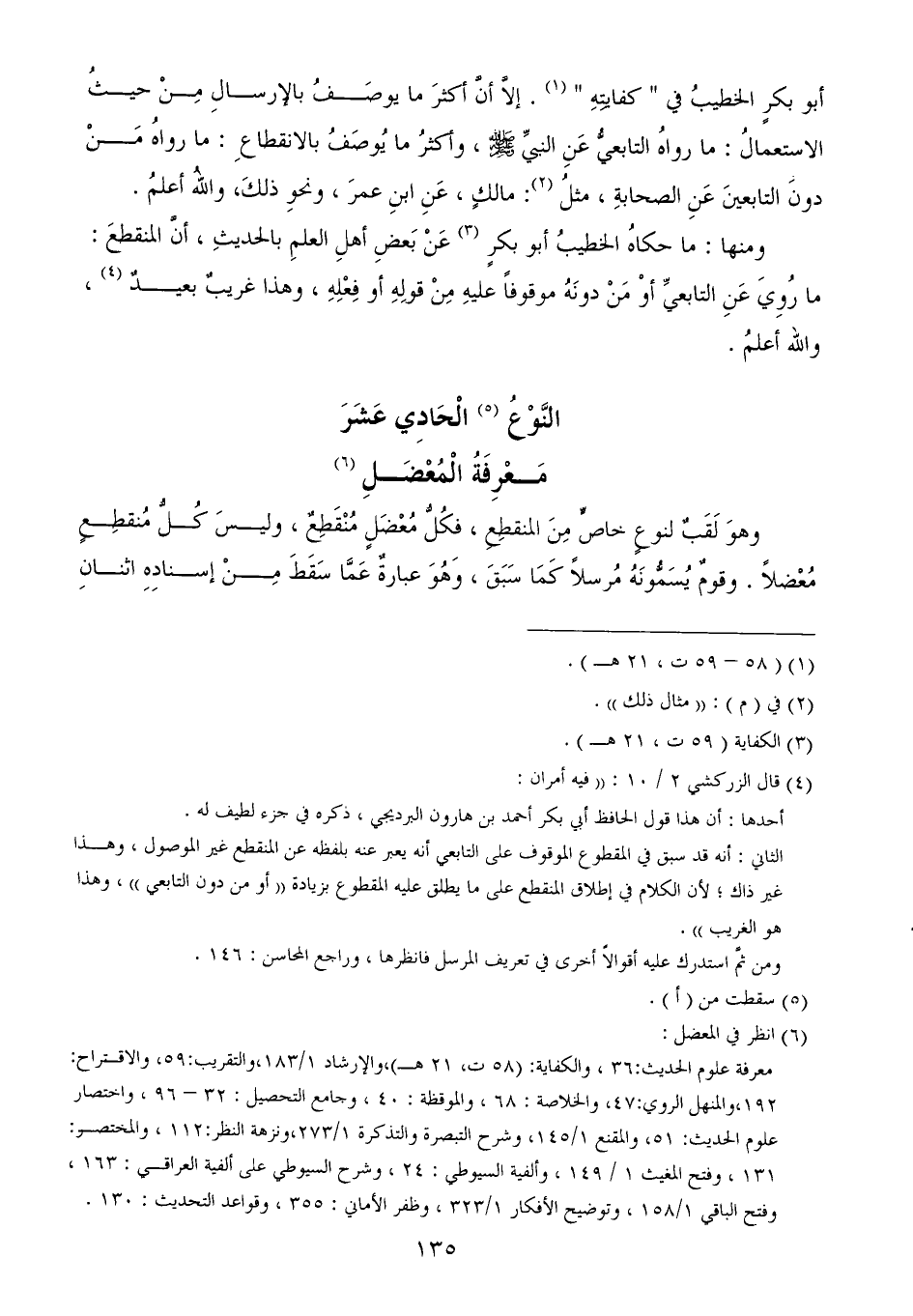 ومنها: ما حكاهُ الخطيبُ أبو بكرٍ (¬3) عَنْ بَعضِ أهلِ العلمِ بالحديثِ، أنَّ المنقطعَ: ما رُوِيَ عَنِ التابعيِّ أوْ مَنْ دونَهُ موقوفاً عليهِ مِنْ قولِهِ أو فِعْلِهِ، وهذا غريبٌ بعيدٌ (¬4)، والله أعلمُ.