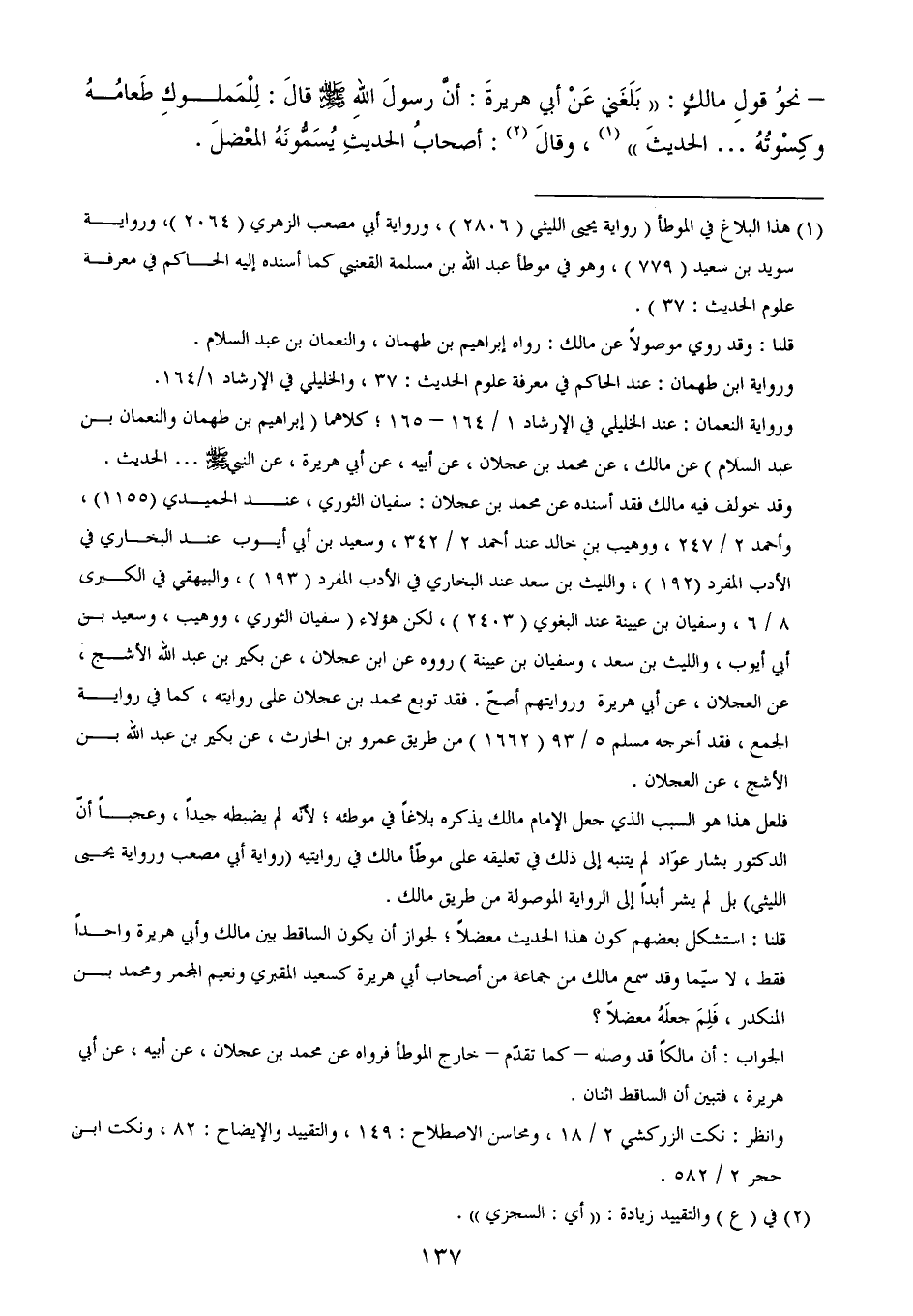 قلنا: استشكل بعضهم كون هذا الحديث معضلاً؛ لجواز أن يكون الساقط بين مالك وأبي هريرة واحداً فقط، لا سيّما وقد سمع مالك من جماعة من أصحاب أبي هريرة كسعيد المقبري ونعيم المجمر ومحمد بن المنكدر، فَلِمَ جعلَهُ معضلاً؟