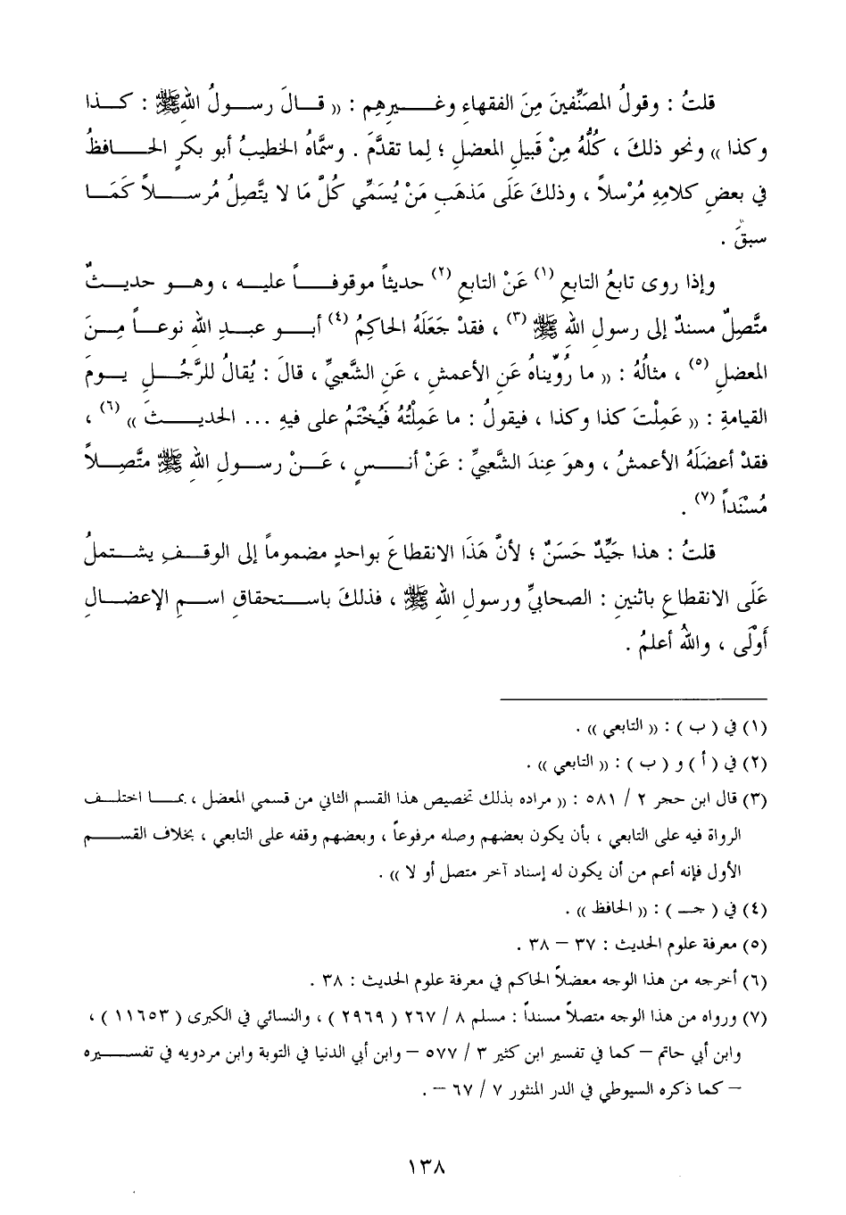 (¬3) قال ابن حجر 2/ 581: ((مراده بذلك تخصيص هذا القسم الثاني من قسمي المعضل، بما اختلف الرواة فيه على التابعي، بأن يكون بعضهم وصله مرفوعاً، وبعضهم وقفه على التابعي، بخلاف القسم الأول فإنه أعم من أن يكون له إسناد آخر متصل أو لا)).