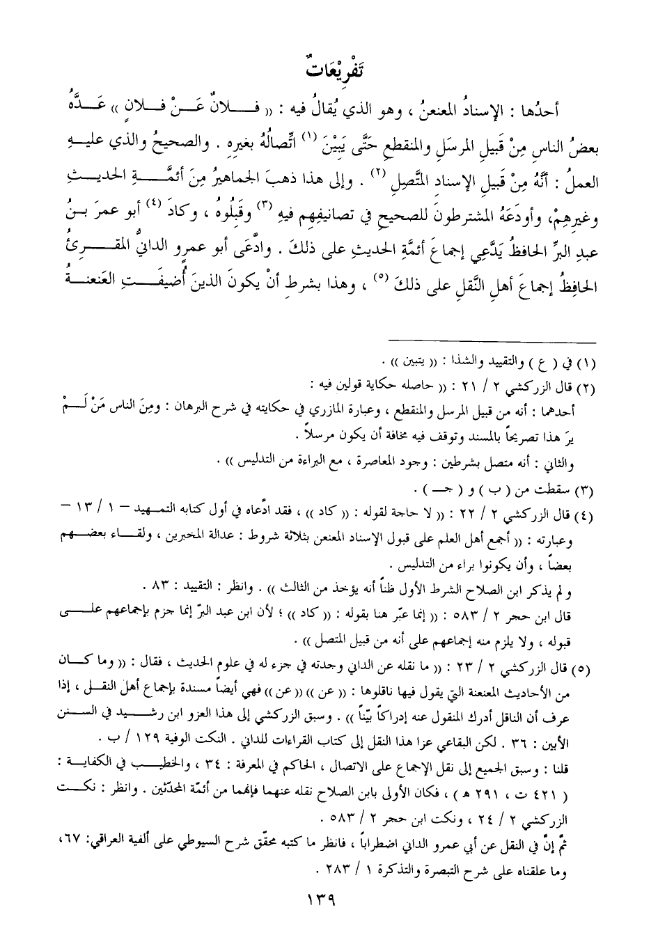 (¬5) قال الزركشي 2/ 23: ((ما نقله عن الداني وجدته في جزء له في علوم الحديث، فقال: ((وما كان من الأحاديث المعنعنة التي يقول فيها ناقلوها: ((عن)) ((عن)) فهي أيضاً مسندة بإجماع أهل النقل، إذا عرف أن الناقل أدرك المنقول عنه إدراكاً بيّناً)). وسبق الزركشي إلى هذا العزو ابن رشيد في السنن