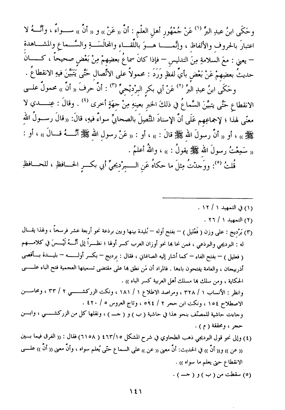 وحَكَى ابنُ عبدِ البرِّ (¬2) عَنْ أبي بكرٍ البِرْدِيْجِيِّ (¬3): أنَّ حرفَ ((أنَّ)) محمولٌ على الانقطاعِ حَتَّى يتبيَّنَ السَّماعُ في ذلكَ الخبرِ بعينِهِ مِنْ جِهَةٍ أخرى (¬4). وقالَ: عِندي لا معنًى لهذا؛ لإجماعِهِم عَلَى أنَّ الإسنادَ المتَّصِلَ بالصحابيِّ سواءٌ فيهِ، قالَ: ((قالَ رسولُ اللهِ - صلى الله عليه وسلم -))، أو ((أنَّ رسولَ اللهِ - صلى الله عليه وسلم - قالَ:))، أو: ((عَنْ رسولِ اللهِ - صلى الله عليه وسلم - أنَّهُ قالَ))، أو: