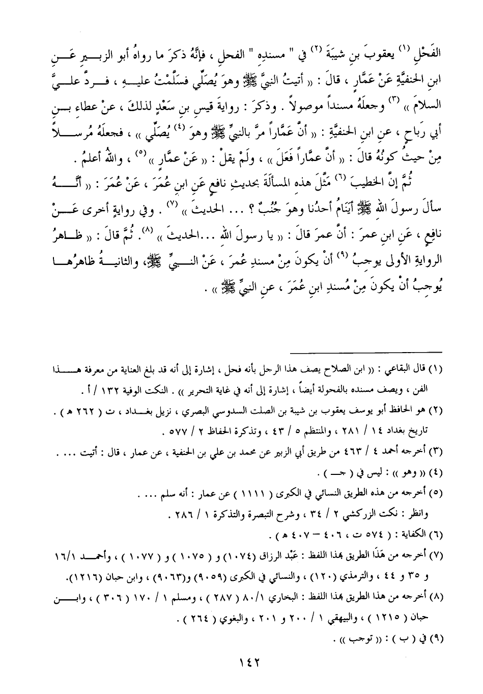 (¬1) قال البقاعي: ((ابن الصلاح يصف هذا الرجل بأنه فحل، إشارة إلى أنه قد بلغ العناية من معرفة هذا الفن، ويصف مسنده بالفحولة أيضاً، إشارة إلى أنه في غاية التحرير)). النكت الوفية 132 / أ.