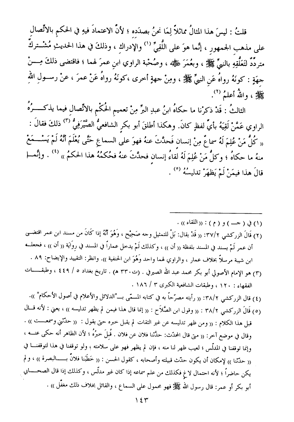 قلتُ: ليسَ هذا المثالُ مماثلاً لِمَا نحنُ بصدَدِهِ؛ لأنَّ الاعتمادَ فيهِ في الحكمِ بالاتِّصالِ على مذهبِ الجمهورِ، إنَّما هوَ على اللُّقِيِّ (¬1) والإدراكِ، وذلكَ في هذا الحديثِ مُشْتركٌ متردِّدٌ لتَعَلُّقِهِ بالنبيِّ - صلى الله عليه وسلم -، وبعُمَرَ - رضي الله عنه -، وصُحْبة الراوي ابنِ عمرَ لهما؛ فاقتضى ذلكَ مِنْ جِهَةٍ: كونَهُ رواهُ عَنِ النبيِّ - صلى الله عليه وسلم -، ومِنْ جهةٍ أخرى، كونَهُ رواهُ عَنْ عمرَ، عنْ رسولِ اللهِ - صلى الله عليه وسلم -، واللهُ أعلمُ (¬2).