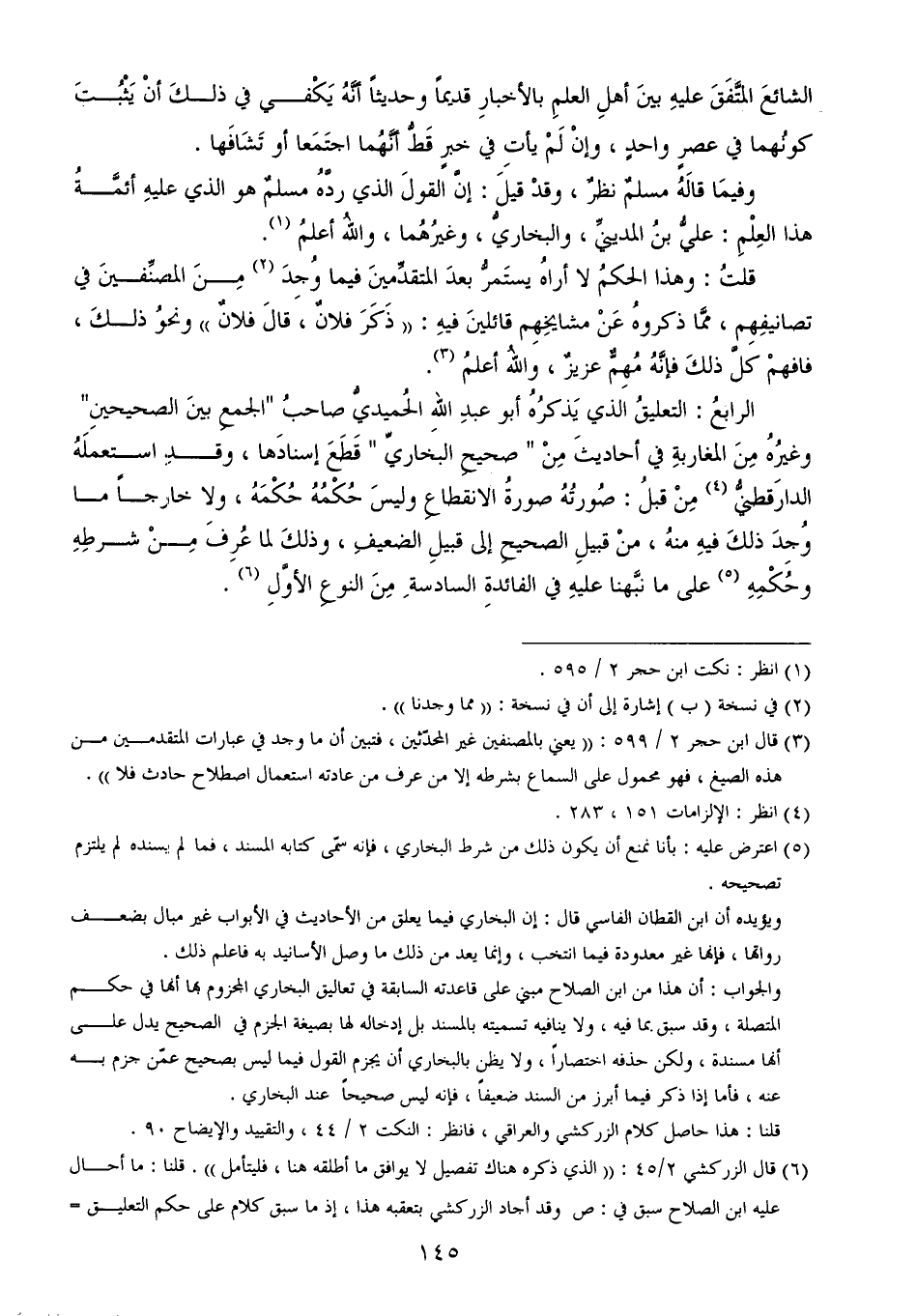 (¬6) قال الزركشي 2/ 45: ((الذي ذكره هناك تفصيل لا يوافق ما أطلقه هنا، فليتأمل)). قلنا: ما أحال عليه ابن الصلاح سبق في: ص وقد أجاد الزركشي بتعقبه هذا، إذ ما سبق كلام على حكم التعليق =