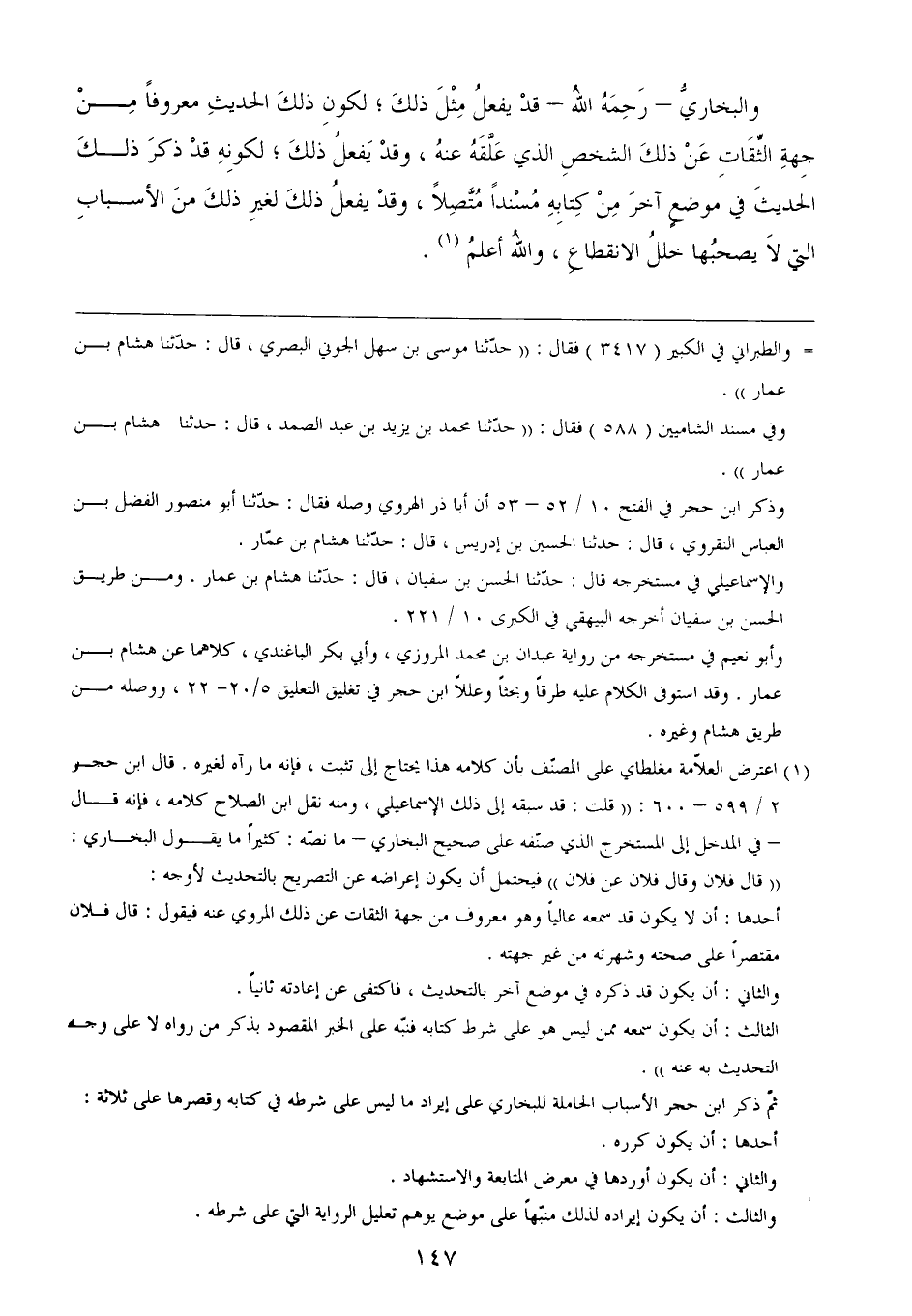 والبخاريُّ - رَحِمَهُ اللهُ - قدْ يفعلُ مِثْلَ ذلكَ؛ لكونِ ذلكَ الحديثِ معروفاً مِنْ جِهةِ الثِّقَاتِ عَنْ ذلكَ الشخصِ الذي عَلَّقَهُ عنهُ، وقدْ يَفعلُ ذلكَ؛ لكونِهِ قدْ ذكرَ ذلكَ الحديثَ في موضعٍ آخرَ مِنْ كِتابِهِ مُسْنداً مُتَّصِلاً، وقدْ يفعلُ ذلكَ لغيرِ ذلكَ منَ الأسبابِ التي لاَ يصحبُها خللُ الانقطاعِ، واللهُ أعلمُ (¬1).