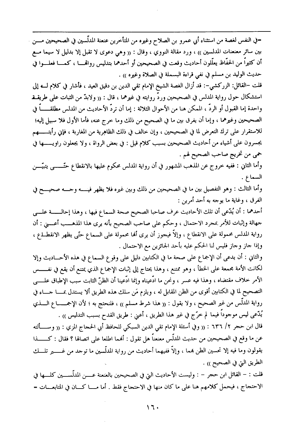 = في النفس لغصة من استثناء أبي عمرو بن الصلاح وغيره من المتأخرين عنعنة المدلّسين في الصحيحين من بين سائر معنعنات المدلسين))، ورد مقالة النووي، وقال: ((وهي دعوى لا تقبل إلا بدليل لا سيما مع أن كثيراً من الحفّاظ يعلّلون أحاديث وقعت في الصحيحين أو أحدهما بتدليس رواتها، كما فعلوا في حديث الوليد بن مسلم في نفي قراءة البسملة في الصلاة وغيره)).