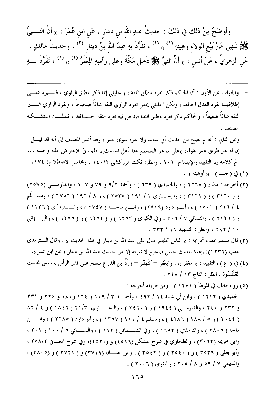 وأوضَحُ مِنْ ذلكَ في ذلكَ: حديثُ عبدِ اللهِ بنِ دينارٍ، عَنِ ابنِ عُمَرَ: ((أنَّ النبيَّ - صلى الله عليه وسلم - نَهَى عَنْ بَيْعِ الوَلاءِ وهِبَتِهِ (¬1)) (¬2)، تَفَرَّدَ بهِ عبدُ اللهِ بنُ دينارٍ (¬3). وحديثُ مالكٍ، عَنِ الزهريِّ، عَنْ أنسٍ: ((أنَّ النبيَّ - صلى الله عليه وسلم - دَخَلَ مَكَّةَ وعلى رأسِهِ المِغْفَرُ (¬4)) (¬5)، تَفَرَّدَ بهِ