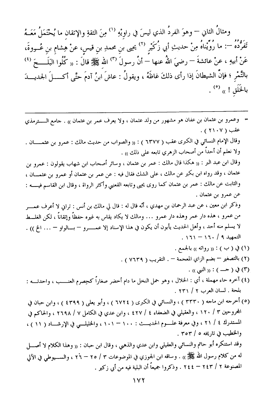 ومثالُ الثاني - وهوَ الفردُ الذي ليسَ في راوِيْهِ (¬1) مِنَ الثقةِ والإتقانِ ما يُحْتَمَلُ مَعَهُ تَفَرُّدُهُ -: ما رُوِّيْناهُ مِنْ حديثِ أبي زُكَيْرٍ (¬2) يحيى بنِ محمدِ بنِ قيسٍ، عنْ هِشامِ بنِ عُروةَ، عَنْ أبيهِ، عنْ عائشةَ - رضيَ اللهُ عنها - أنَّ رسولَ (¬3) اللهِ - صلى الله عليه وسلم - قالَ: ((كُلُوا البَلَحَ (¬4) بالتَّمْرِ؛ فإنَّ الشيطانَ إذا رأى ذلكَ غاظَهُ، ويقولُ: عاشَ ابنُ آدمَ حتَّى أكلَ الجديدَ بالخَلَقِ!)) (¬5).