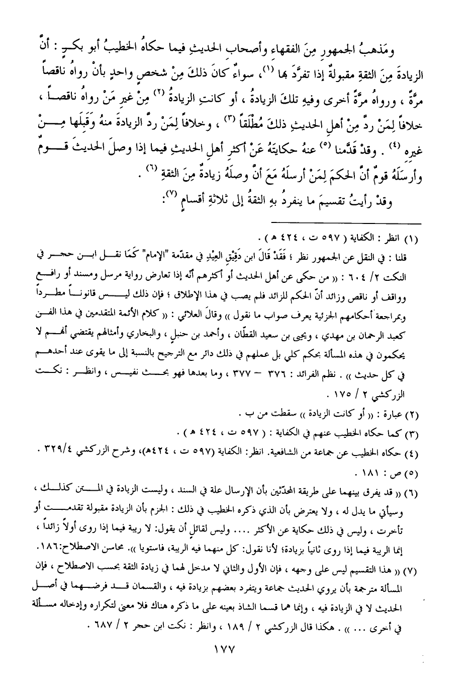 (¬7) ((هذا التقسيم ليس على وجهه، فإن الأول والثاني لا مدخل لهما في زيادة الثقة بحسب الاصطلاح، فإن المسألة مترجمة بأن يروي الحديث جماعة ويتفرد بعضهم بزيادة فيه، والقسمان قد فرضهما في أصل الحديث لا في الزيادة فيه، وإنما هما قسما الشاذ بعينه على ما ذكره هناك فلا معنى لتكراره وإدخاله مسألة في أخرى ... )). هكذا قال الزركشي 2/ 189، وانظر: نكت ابن حجر 2/ 687.