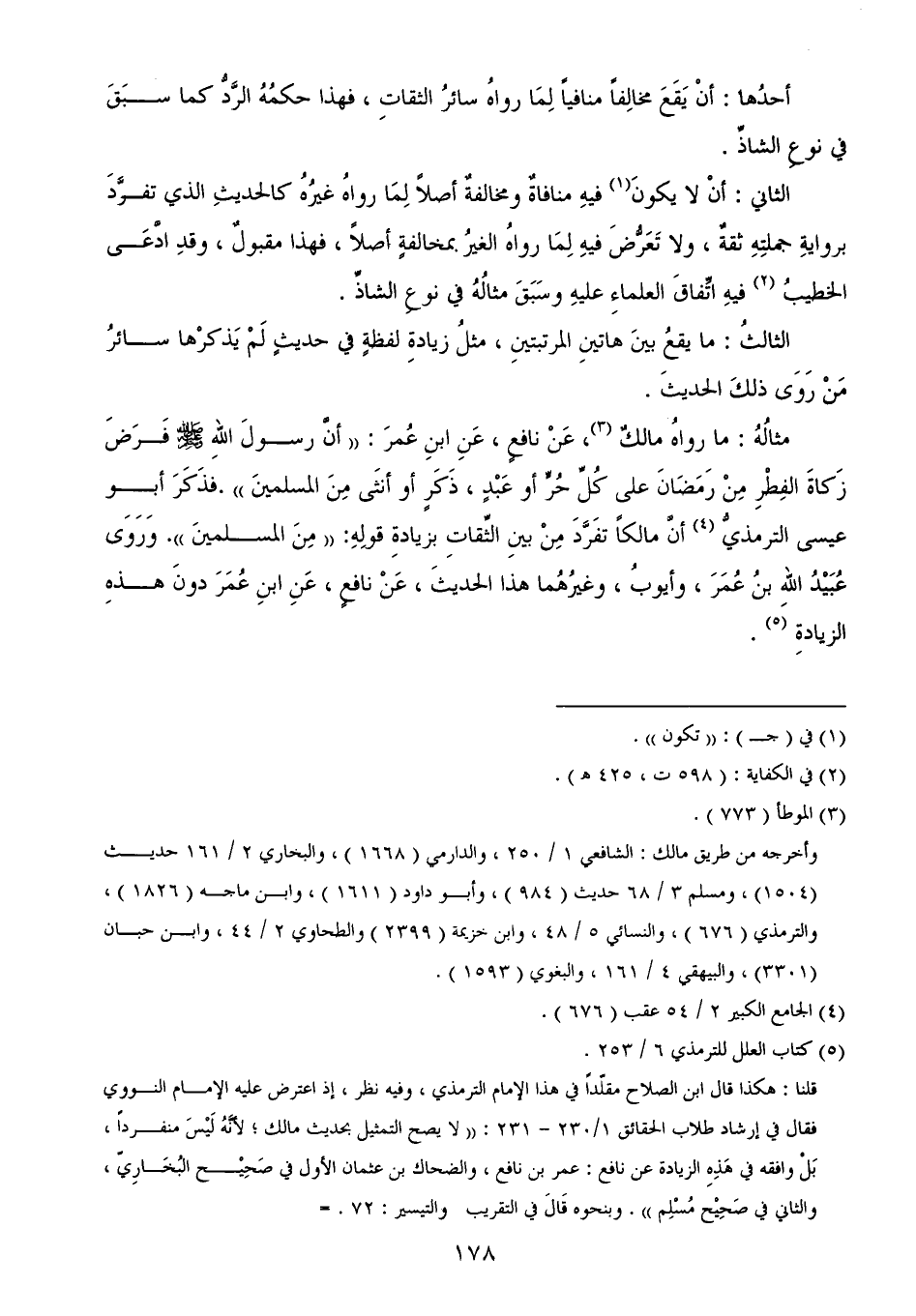 قلنا: هكذا قال ابن الصلاح مقلّداً في هذا الإمام الترمذي، وفيه نظر، إذ اعترض عليه الإمام النووي فقال في إرشاد طلاب الحقائق 1/ 230 - 231: ((لا يصح التمثيل بحديث مالك؛ لأنَّهُ لَيْسَ منفرداً، بَلْ وافقه في هَذِهِ الزيادة عن نافع: عمر بن نافع، والضحاك بن عثمان الأول في صَحِيْح البُخَارِيّ، والثاني في صَحِيْح مُسْلِم)). وبنحوه قَالَ في التقريب والتيسير: 72. =