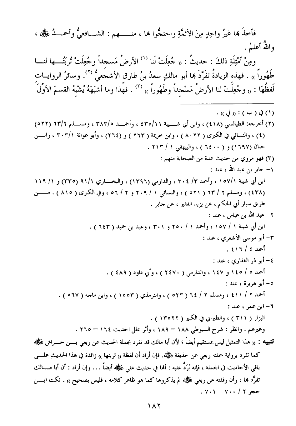 تنبيه: ((هذا التمثيل ليس بمستقيم أيضاً؛ لأن أبا مالك قد تفرد بجملة الحديث عن ربعي بن حراش - رضي الله عنه - كما تفرد برواية جملته ربعي عن حذيفة - رضي الله عنه -. فإن أراد أن لفظة ((تربتها)) زائدة في هذا الحديث على باقي الأحاديث في الجملة، فإنه يُرَدُّ عليه: أنها في حديث علي - رضي الله عنه - أيضاً ... وإن أراد: أن أبا مالك تفرَّد بها، وأن رفقته عن ربعي - رضي الله عنه - لم يذكروها كما هو ظاهر كلامه، فليس بصحيح)). نكت ابن حجر 2/ 700 - 701.