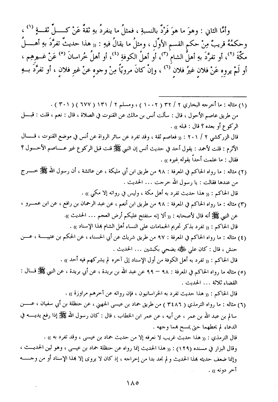 وأمَّا الثاني: وهوَ ما هوَ فَرْدٌ بالنسبةِ، فمثلُ ما ينفردُ بهِ ثقةٌ عَنْ كلِّ ثقةٍ (¬1)، وحكمُهُ قريبٌ مِنْ حكمِ القسمِ الأوَّلِ، ومثلُ ما يقالُ فيهِ: ((هذا حديثٌ تفرَّدَ بهِ أهلُ مكَّةَ (¬2)، أو تفرَّدَ بهِ أهلُ الشامِ (¬3)، أو أهلُ الكوفةِ (¬4)، أو أهلُ خُراسانَ (¬5) عَنْ غيرِهِم، أو لَمْ يروِهِ عَنْ فلانٍ غيرُ فلانٍ (¬6)، وإنْ كانَ مرويّاً مِنْ وجوهٍ عنْ غيرِ فلانٍ، أو تفرَّدَ بهِ