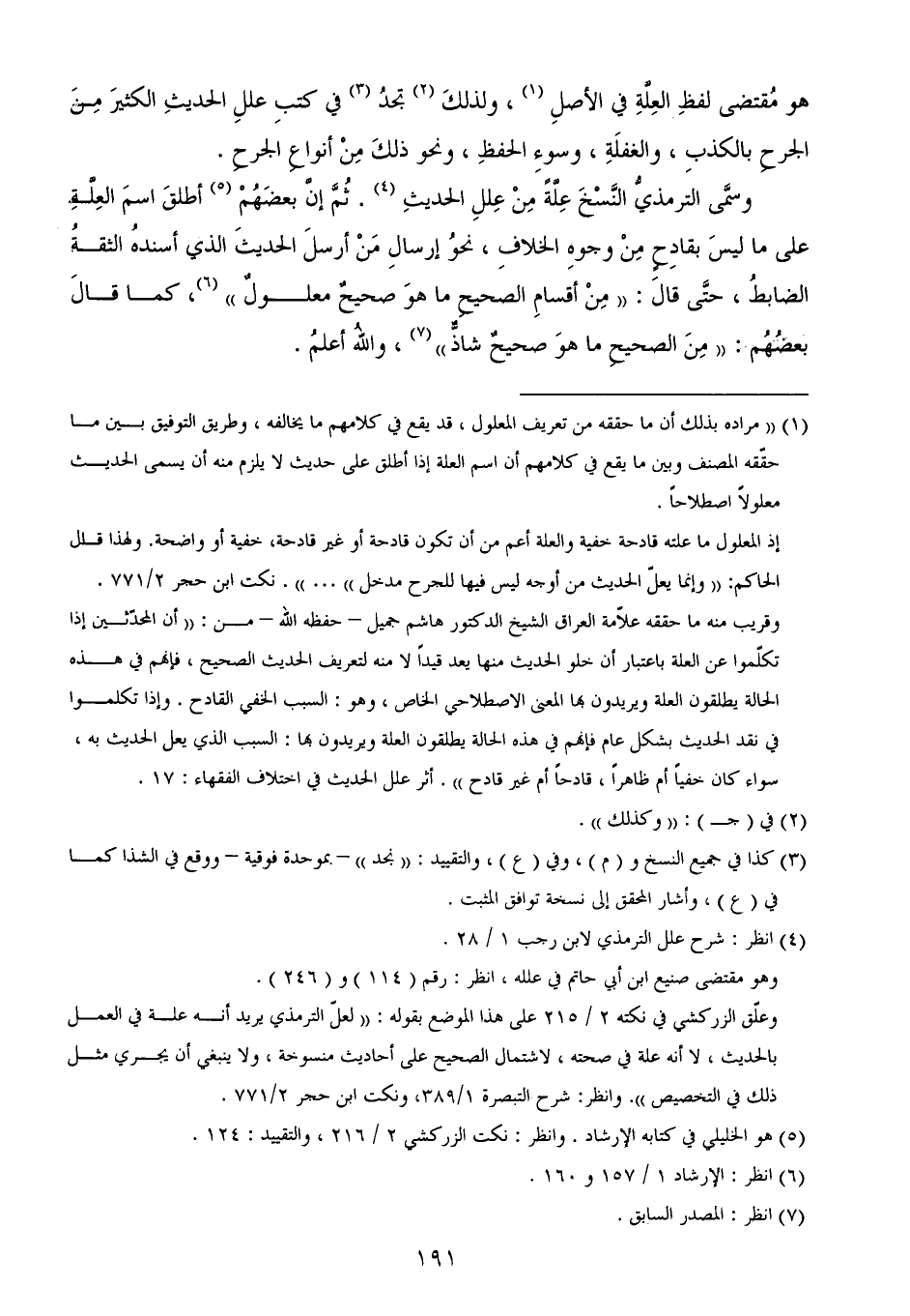 وقريب منه ما حققه علاّمة العراق الشيخ الدكتور هاشم جميل - حفظه الله - من: ((أن المحدّثين إذا تكلّموا عن العلة باعتبار أن خلو الحديث منها يعد قيداً لا منه لتعريف الحديث الصحيح، فإنهم في هذه الحالة يطلقون العلة ويريدون بها المعنى الاصطلاحي الخاص، وهو: السبب الخفي القادح. وإذا تكلموا في نقد الحديث بشكل عام فإنهم في هذه الحالة يطلقون العلة ويريدون بها: السبب الذي يعل الحديث به، سواء كان خفياً أم ظاهراً، قادحاً أم غير قادح)). أثر علل الحديث في اختلاف الفقهاء: 17.