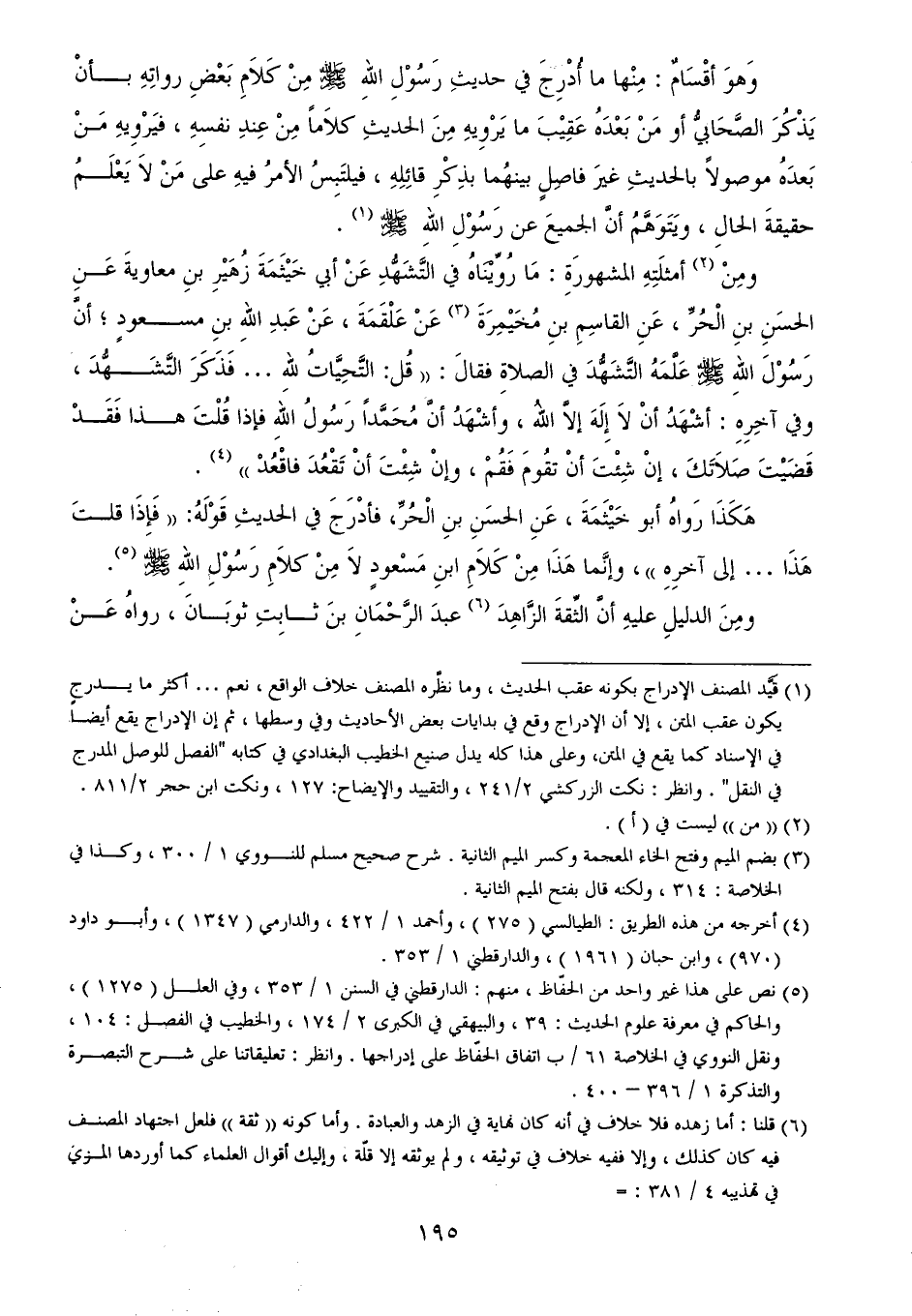 (¬5) نص على هذا غير واحد من الحفّاظ، منهم: الدارقطني في السنن 1/ 353، وفي العلل (1275)، والحاكم في معرفة علوم الحديث: 39، والبيهقي في الكبرى 2/ 174، والخطيب في الفصل: 104، ونقل النووي في الخلاصة 61 / ب اتفاق الحفّاظ على إدراجها. وانظر: تعليقاتنا على شرح التبصرة والتذكرة 1/ 396 - 400.