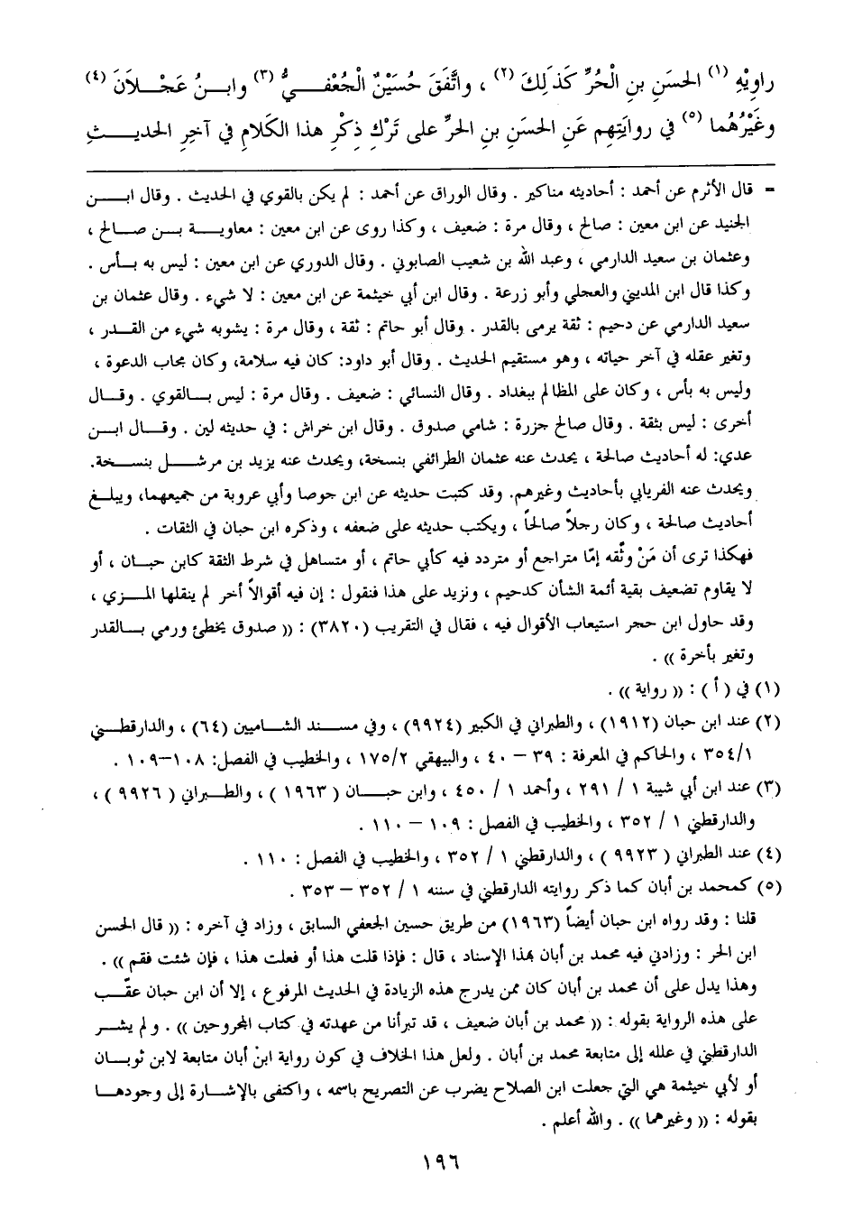 راوِيْهِ (¬1) الحسَنِ بنِ الْحُرِّ كَذَلِكَ (¬2)، واتَّفَقَ حُسَيْنٌ الْجُعْفيُّ (¬3) وابنُ عَجْلاَنَ (¬4) وغَيْرُهُما (¬5) في روايَتِهِم عَنِ الحسَنِ بنِ الحرِّ على تَرْكِ ذِكْرِ هذا الكَلامِ في آخِرِ الحديثِ