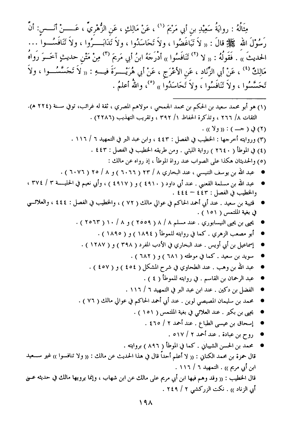 قال حمزة بن محمد الكناني: ((لا أعلم أحداً قال في هذا الحديث عن مالك: ((ولا تنافسوا)) غير سعيد ابن أبي مريم)). التمهيد 6/ 116.
