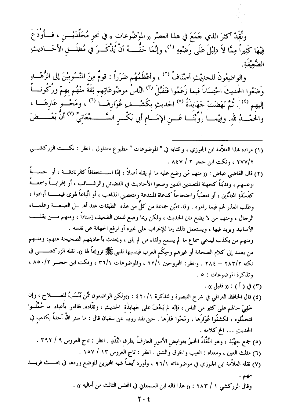(¬1) مراده بهذا العلاّمة ابن الجوزي، وكتابه في " الموضوعات " مطبوع متداول. انظر: نكت الزركشي 2/ 277، ونكت ابن حجر 2/ 847.