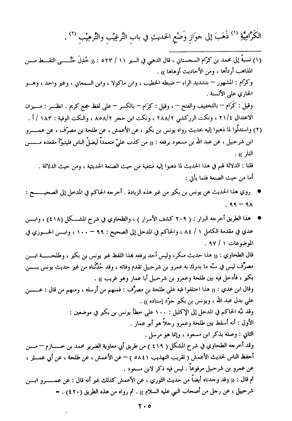 (¬2) واستدلّوا لما ذهبوا إليه بحديث رواه يونس بن بكير، عن الأعمش، عن طلحة بن مصرّف، عن عمرو ابن شرحبيل، عن عبد الله بن مسعود يرفعه: ((من كذب عليّ متعمداً ليضلّ الناس فليتبوّأ مقعده من النار)).