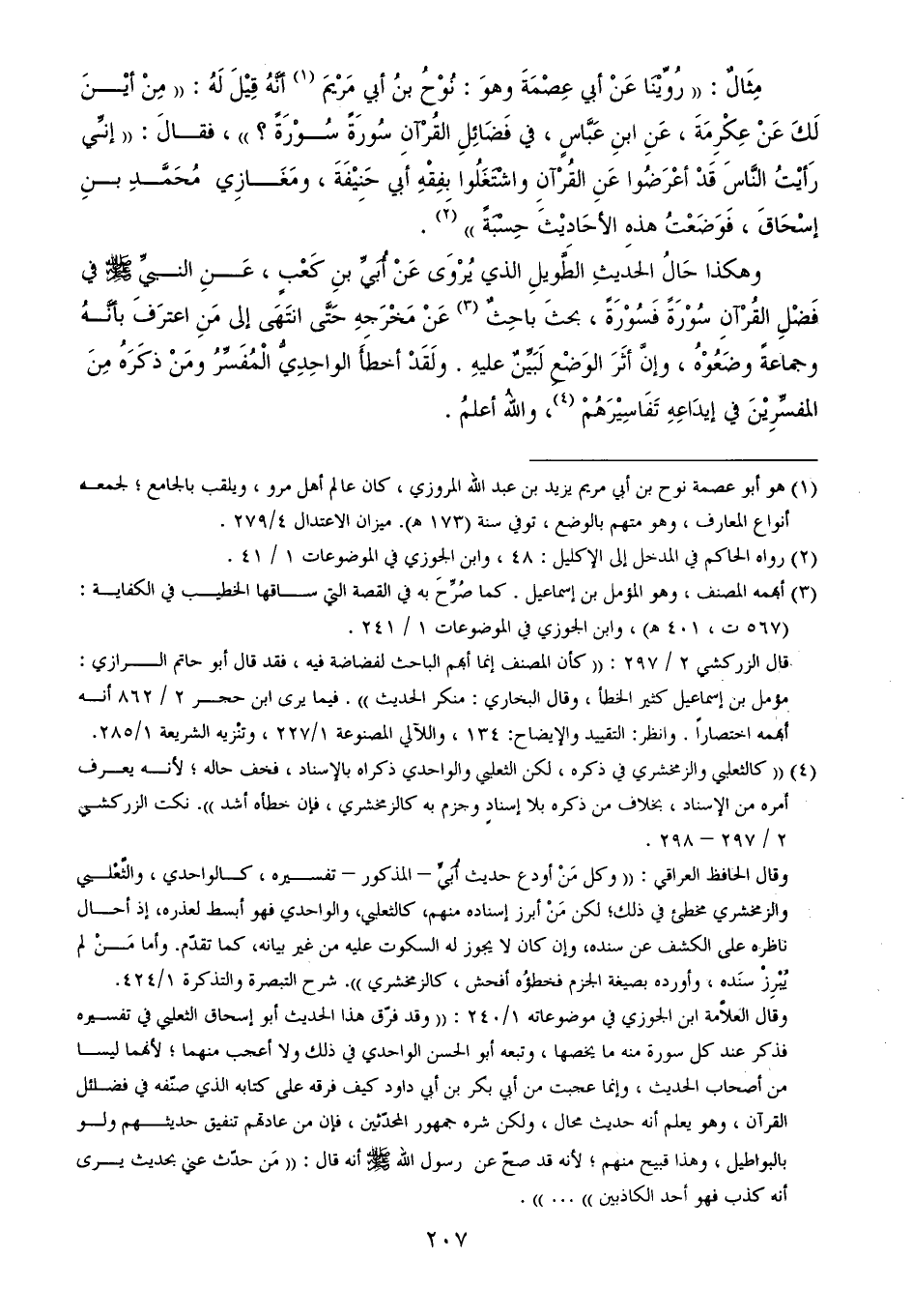 وهكذا حَالُ الحديثِ الطَّويلِ الذي يُرْوَى عَنْ أُبَيِّ بنِ كَعْبٍ، عَنِ النبيِّ - صلى الله عليه وسلم - في فَضْلِ القُرْآنِ سُوْرَةً فَسُوْرَةً، بحثَ باحِثٌ (¬3) عَنْ مَخْرَجِهِ حَتَّى انتَهَى إلى مَنِ اعترَفَ بأنَّهُ وجماعةً وضَعُوْهُ، وإنَّ أثَرَ الوَضْعِ لَبَيِّنٌ عليهِ. ولَقَدْ أخطأَ الواحِدِيُّ الْمُفَسِّرُ ومَنْ ذكَرَهُ مِنَ المفسِّرِيْنَ في إيدَاعِهِ تَفَاسِيْرَهُمْ (¬4)، واللهُ أعلمُ.