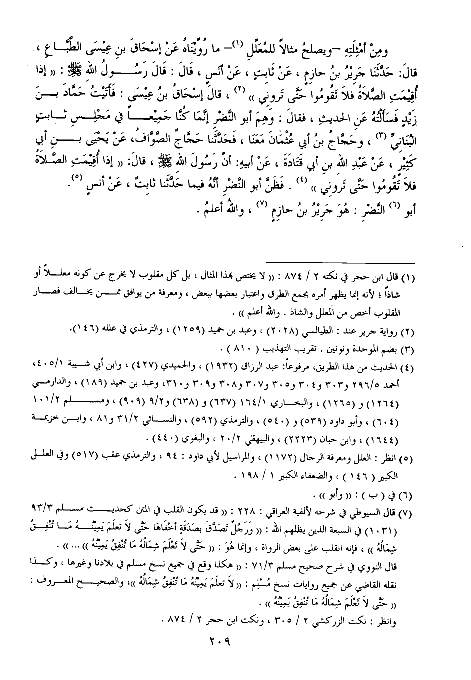 ومِنْ أمْثِلَتِهِ -ويصلحُ مثالاً للمُعَلَّلِ (¬1) - ما رُوِّيْنَاهُ عَنْ إسْحَاقَ بنِ عِيْسَى الطَّبَّاعِ، قالَ: حَدَّثَنَا جَرِيْرُ بنُ حازِمٍ، عَنْ ثَابِتٍ، عَنْ أنَسٍ، قَالَ: قَالَ رَسُولُ اللهِ - صلى الله عليه وسلم -: ((إذا أُقِيْمَتِ الصَّلاَةُ فلاَ تَقُومُوا حَتَّى تَرونِي)) (¬2)، قالَ إسْحَاقُ بنُ عِيْسَى: فَأَتَيْتُ حَمَّادَ بنَ زَيْدٍ فَسَأَلْتُهُ عَنِ الحديثِ، فقالَ: وَهِمَ أبو النَّضْرِ إنَّمَا كُنَّا جَمِيْعاً في مَجْلِسِ ثابتٍ