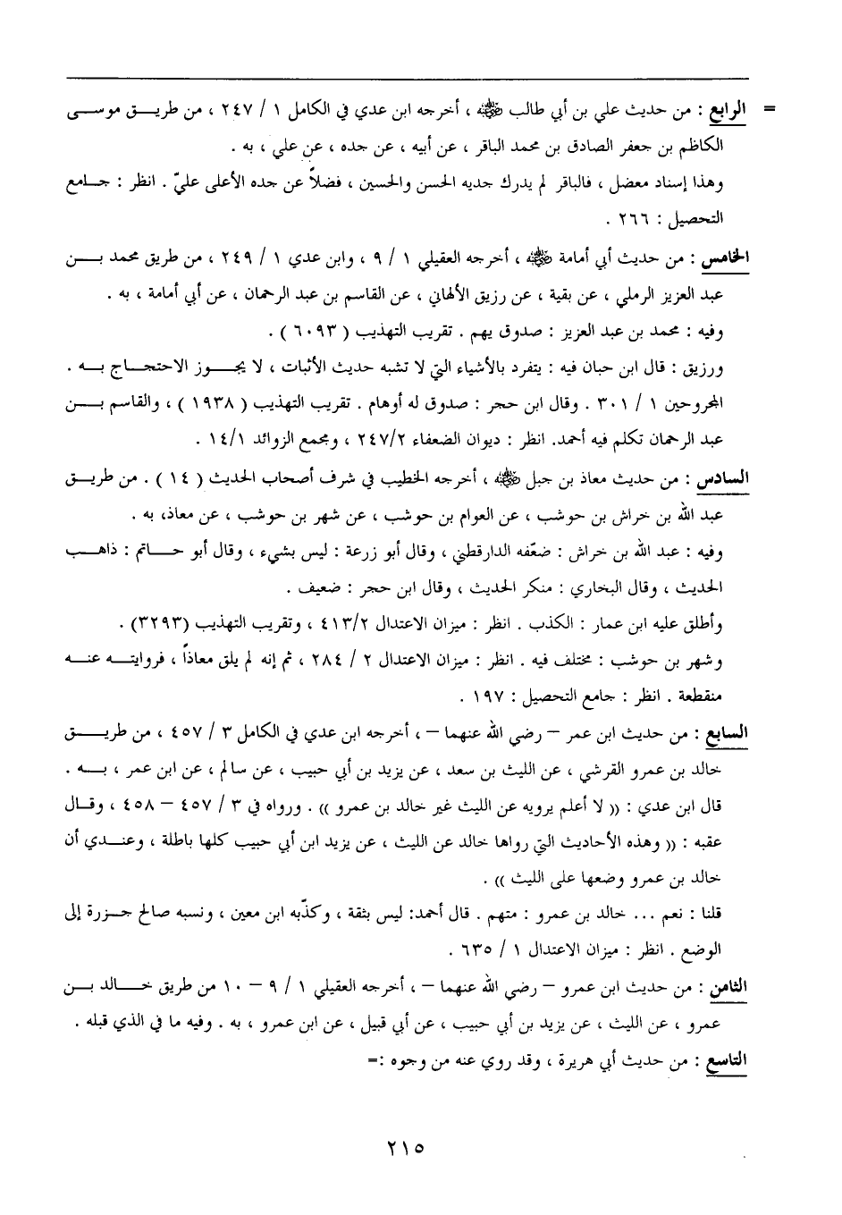 = الرابع: من حديث علي بن أبي طالب - رضي الله عنه -، أخرجه ابن عدي في الكامل 1/ 247، من طريق موسى الكاظم بن جعفر الصادق بن محمد الباقر، عن أبيه، عن جده، عن علي، به.