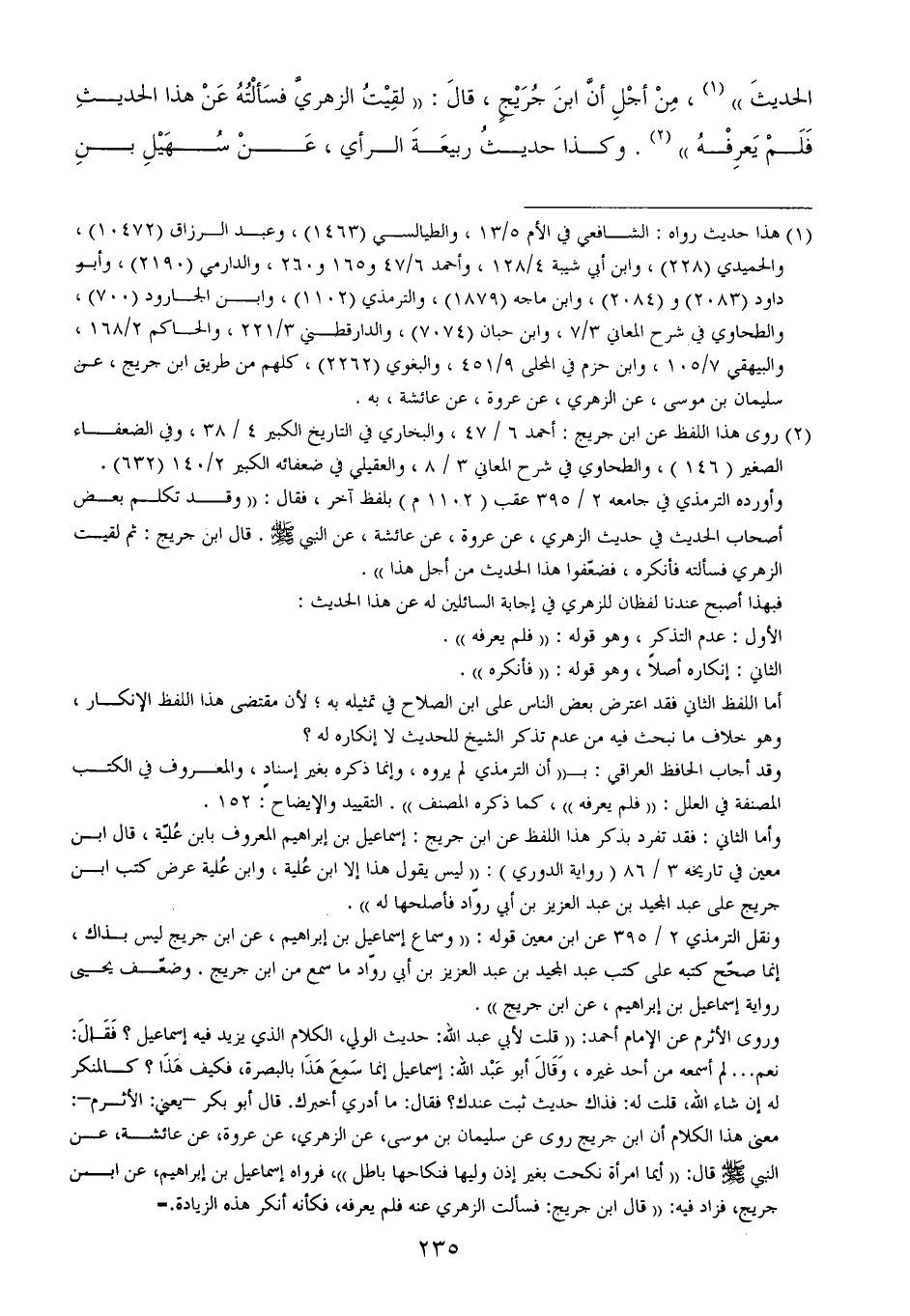وروى الأثرم عن الإمام أحمد: ((قلت لأبي عبد الله: حديث الولي، الكلام الذي يزيد فيه إسماعيل؟ فَقَالَ: نعم ... لم أسمعه من أحد غيره، وَقَالَ أبو عَبْد الله: إسماعيل إنما سَمِعَ هَذَا بالبصرة، فكيف هَذَا؟ كالمنكر له إن شاء الله، قلت له: فذاك حديث ثبت عندك؟ فقال: ما أدري أخبرك. قال أبو بكر -يعني: الأثرم-: معنى هذا الكلام أن ابن جريج روى عن سليمان بن موسى، عن الزهري، عن عروة، عن عائشة، عن