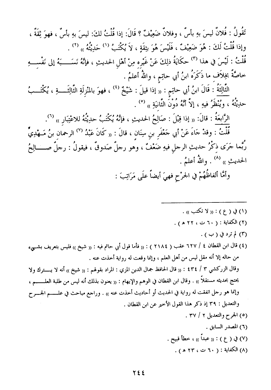 وأمَّا ألفاظُهُمْ في الجرْحِ فهيَ أيضاً علَى مَرَاتِبَ: