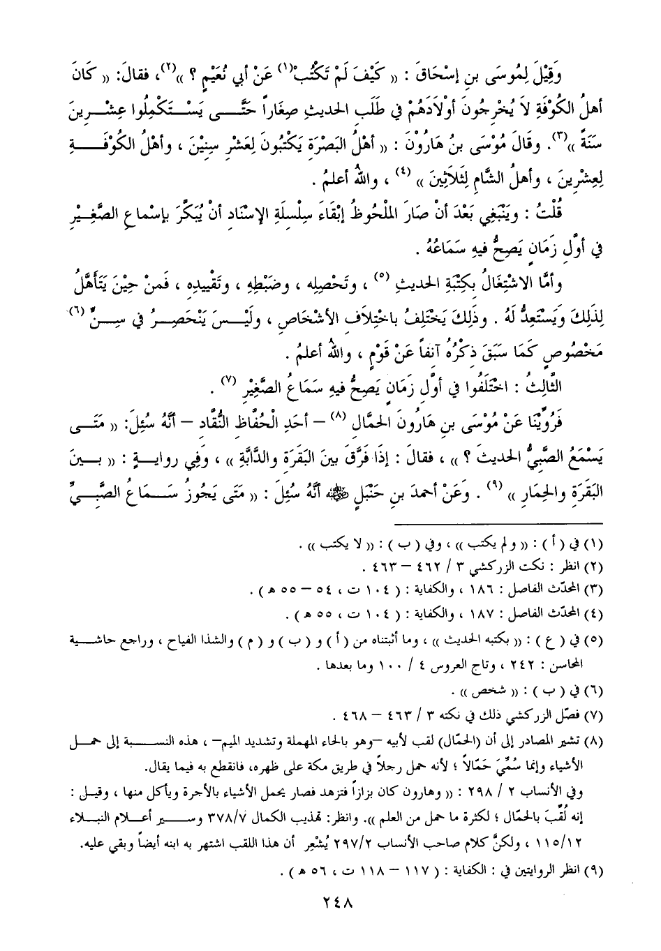 فَرُوِّيْنَا عَنْ مُوْسَى بنِ هَارُونَ الحمَّالِ (¬8) - أحَدِ الْحُفَّاظِ النُّقَّادِ - أنَّهُ سُئِلَ: ((مَتَى يَسْمَعُ الصَّبِيُّ الحديثَ؟))، فقالَ: إذَا فَرَّقَ بينَ البَقَرَةِ والدَّابَّةِ))، وَفِي روايةٍ: ((بينَ البَقَرَةِ والحِمَارِ)) (¬9). وَعَنْ أحمدَ بنِ حَنْبَلٍ - رضي الله عنه - أنَّهُ سُئِلَ: ((مَتَى يَجُوزُ سَمَاعُ الصَّبِيِّ