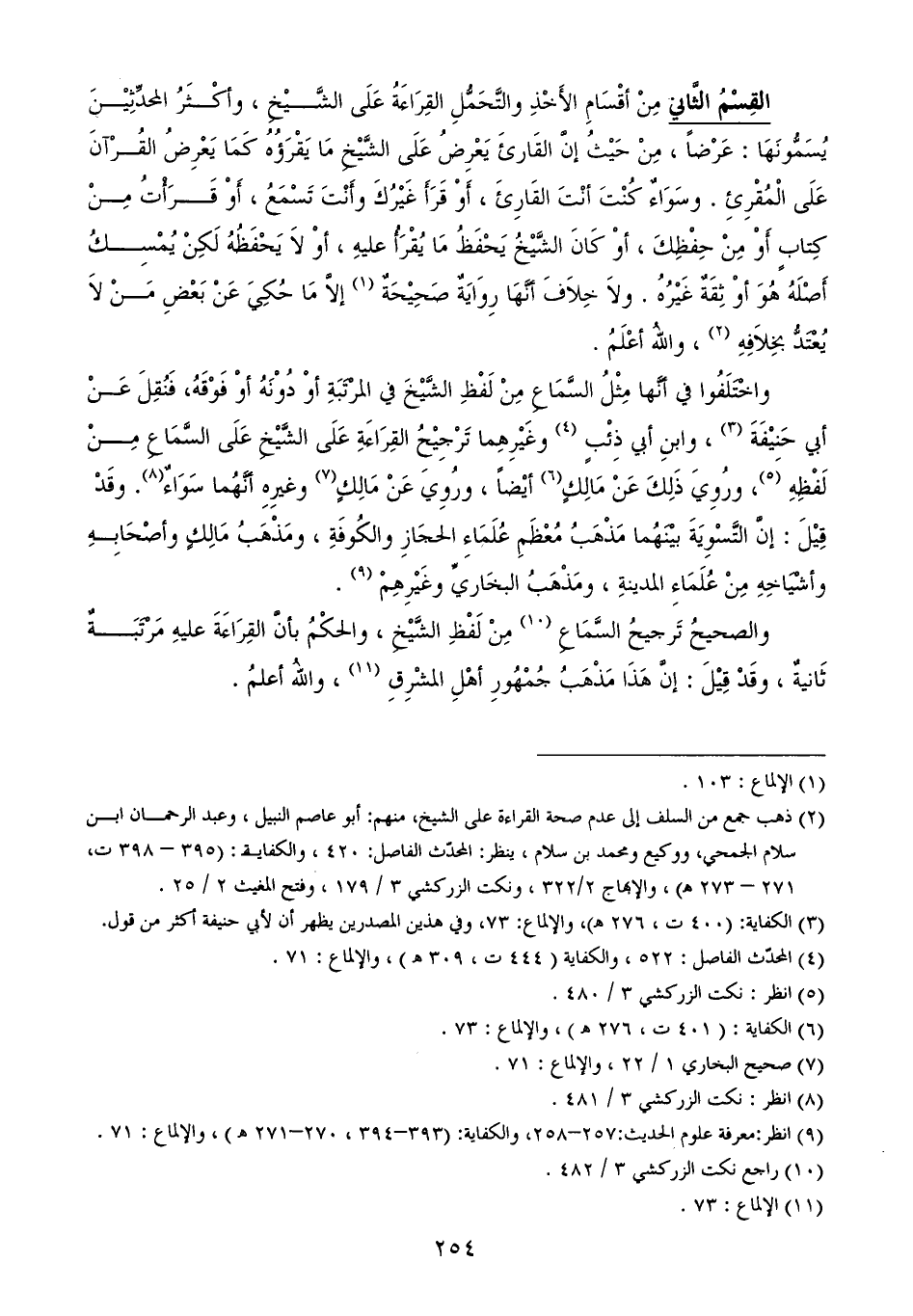 القِسْمُ الثَّاني مِنْ أقْسَامِ الأَخْذِ والتَّحَمُّلِ القِرَاءَةُ عَلَى الشَّيْخِ، وأكْثَرُ المحدِّثِيْنَ يُسَمُّونَهَا: عَرْضاً، مِنْ حَيْثُ إنَّ القَارئَ يَعْرِضُ عَلَى الشَّيْخِ مَا يَقْرَؤُهُ كَمَا يَعْرِضُ القُرْآنَ عَلَى الْمُقْرِئِ. وسَوَاءٌ كُنْتَ أنْتَ القَارِئَ، أَوْ قَرَأَ غَيْرُكَ وأَنْتَ تَسْمَعُ، أَوْ قَرَأْتُ مِنْ كِتابٍ أَوْ مِنْ حِفْظِكَ، أوْ كَانَ الشَّيْخُ يَحْفَظُ مَا يُقْرَأُ عليهِ، أوْ لاَ يَحْفَظُهُ لَكِنْ يُمْسِكُ أَصْلَهُ هُوَ أوْ ثِقَةٌ غَيْرُهُ. ولاَ خِلاَفَ أنَّهَا رِوَايَةٌ صَحِيْحَةٌ (¬1) إلاَّ مَا حُكِيَ عَنْ بَعْضِ مَنْ لاَ يُعْتَدُّ بخِلاَفِهِ (¬2)، واللهُ أعْلَمُ.