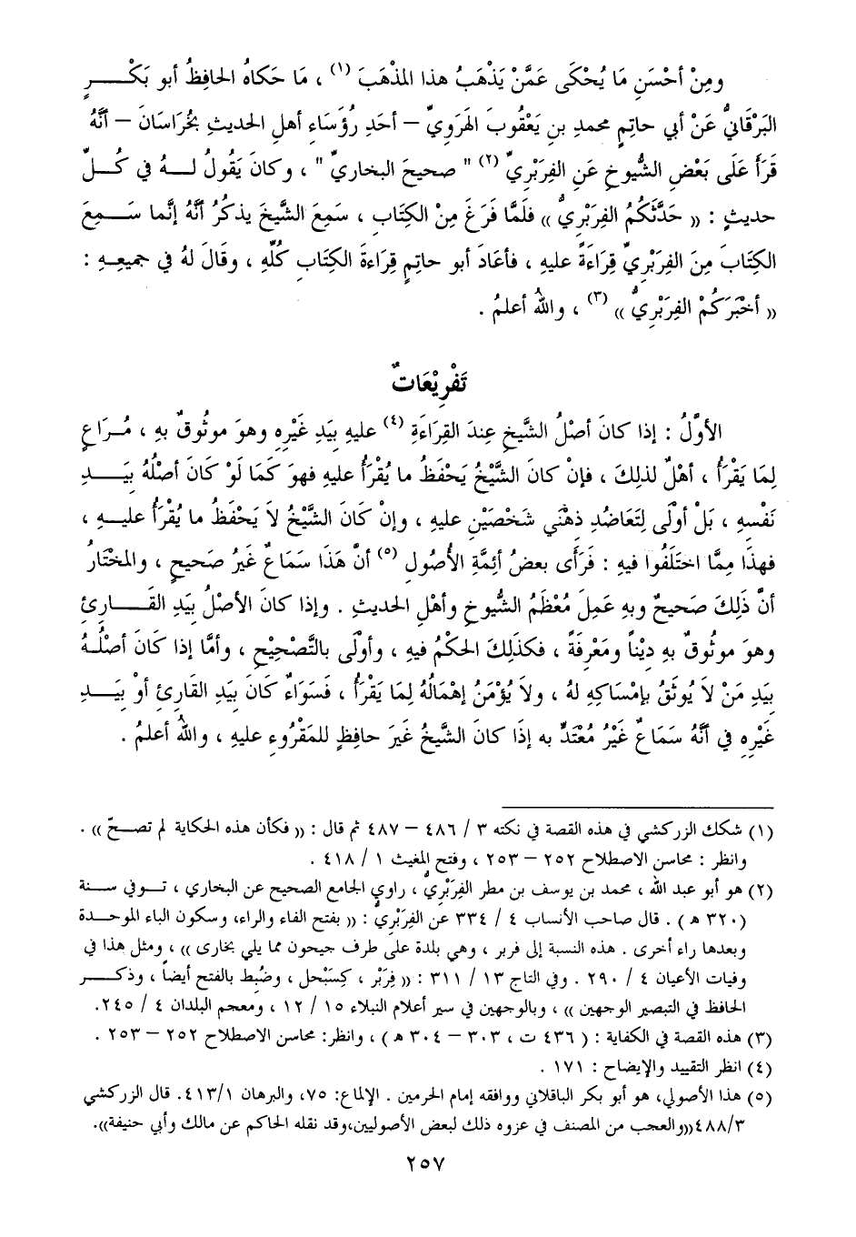 (¬2) هو أبو عبد الله، محمد بن يوسف بن مطر الفِرَبْرِيُّ، راوي الجامع الصحيح عن البخاري، توفي سنة (320 هـ). قال صاحب الأنساب 4/ 334 عن الفِرَبْرِيُّ: ((بفتح الفاء والراء، وسكون الباء الموحدة وبعدها راء أخرى. هذه النسبة إلى فربر، وهي بلدة على طرف جيحون مما يلي بخارى))، ومثل هذا في وفيات الأعيان 4/ 290. وفي التاج 13/ 311: ((فِرَبْر، كِسَبْحل، وضُبِط بالفتح أيضاً، وذكر الحافظ في التبصير الوجهين))، وبالوجهين في سير أعلام النبلاء 15/ 12، ومعجم البلدان 4/ 245.