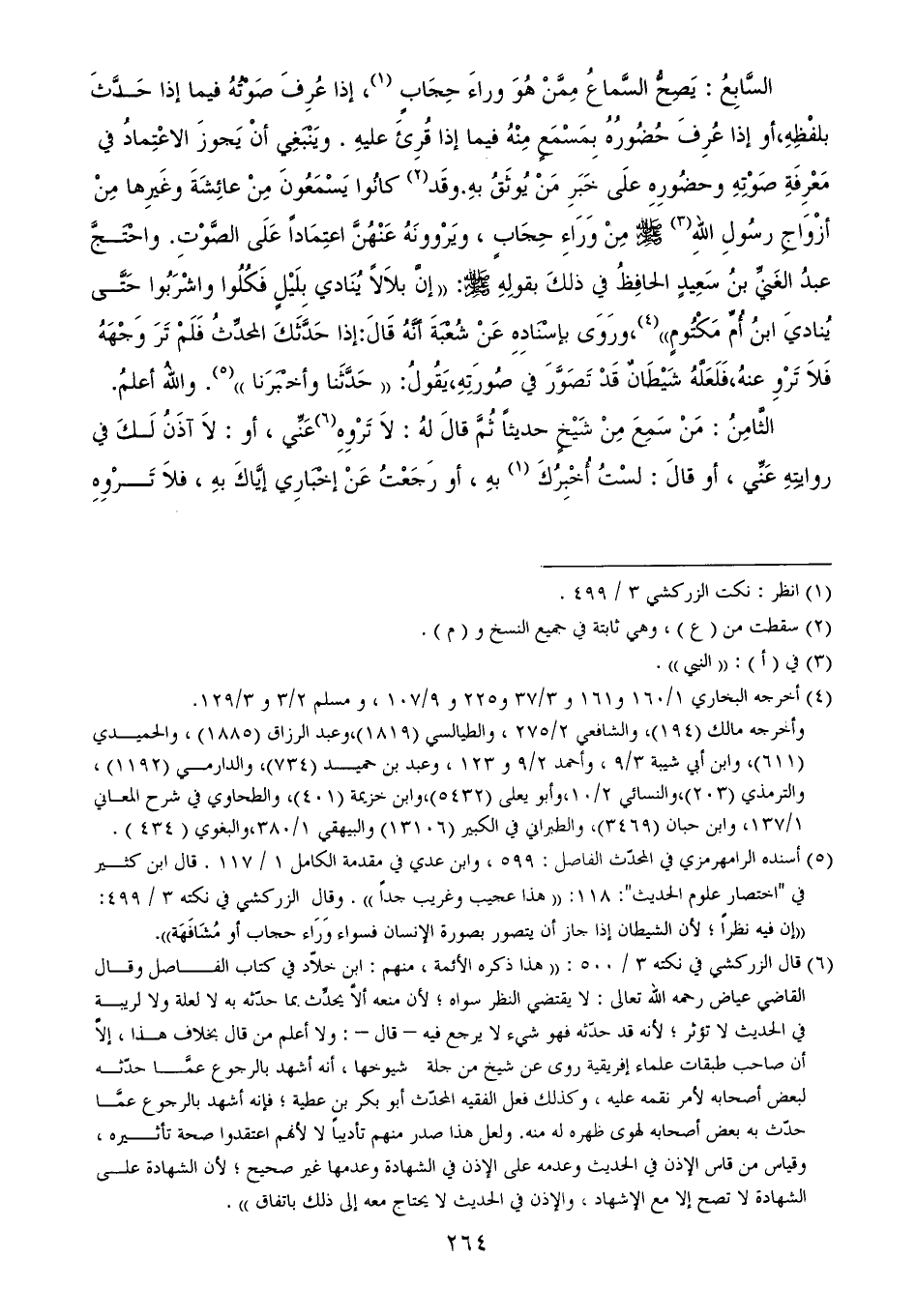 السَّابِعُ: يَصِحُّ السَّماعُ مِمَّنْ هُوَ وراءَ حِجَابٍ (¬1)، إذا عُرِفَ صَوْتُهُ فيما إذا حَدَّثَ بلفْظِهِ، أو إذا عُرِفَ حُضُورُهُ بِمَسْمَعٍ مِنْهُ فيما إذا قُرِئَ عليهِ. ويَنْبَغِي أنْ يَجوزَ الاعْتِمادُ في مَعْرِفَةِ صَوْتِهِ وحضُورِهِ علَى خَبَرِ مَنْ يُوثَقُ بهِ. وقَد (¬2) كانُوا يَسْمَعُونَ مِنْ عائِشَةَ وغَيرِها مِنْ أزْوَاجِ رسُولِ اللهِ (¬3) - صلى الله عليه وسلم - مِنْ وَرَاءِ حِجَابٍ، ويَرْوونَهُ عَنْهُنَّ اعتِمَاداً عَلَى الصَّوْتِ. واحْتَجَّ عبدُ الغَنيِّ بنُ سَعِيدٍ الحافِظُ في ذلكَ بقولِهِ - صلى الله عليه وسلم -: ((إنَّ بلاَلاً يُنَادي بِلَيْلٍ فَكُلُوا واشْرَبُوا حَتَّى يُناديَ ابنُ أُمِّ مَكْتُومٍ)) (¬4)، ورَوَى بإسْنَادِهِ عَنْ شُعْبَةَ أنَّهُ قَالَ: إذا حَدَّثَكَ المحدِّثُ فَلَمْ تَرَ وَجْهَهُ فَلاَ تَرْوِ عنهُ، فَلَعَلَّهُ شَيْطَانٌ قَدْ تَصَوَّرَ في صُورَتِهِ، يَقُولُ: ((حَدَّثَنا وأخْبَرَنا)) (¬5). واللهُ أعلمُ.
