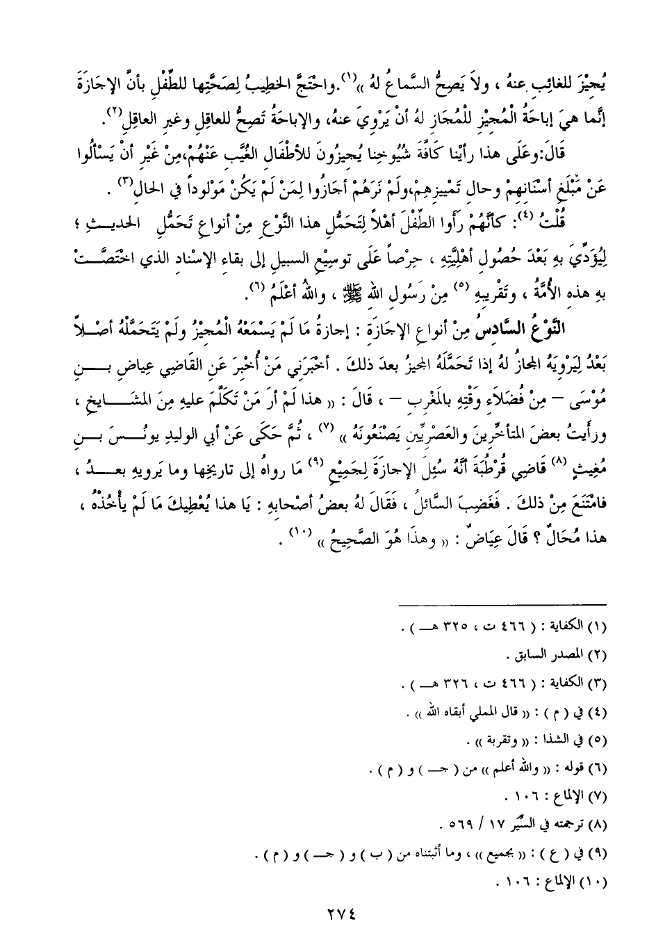 النَّوْعُ السَّادِسُ مِنْ أنواعِ الإجَازَةِ: إجازةُ مَا لَمْ يَسْمَعْهُ الْمُجِيْزُ ولَمْ يَتَحَمَّلْهُ أصْلاً بَعْدُ لِيَرْوِيَهُ المجازُ لهُ إذا تَحَمَّلَهُ المجيزُ بعدَ ذلكَ. أخْبَرَنِي مَنْ أُخْبِرَ عَنِ القَاضِي عِياضِ بنِ مُوْسَى - مِنْ فُضَلاَءِ وَقْتِهِ بالمَغْرِبِ -، قَالَ: ((هذا لَمْ أرَ مَنْ تَكَلَّمَ عليهِ مِنَ المشَايخِ، ورأَيتُ بعضَ المتأخِّرِينَ والعَصْرِيِّينِ يَصْنَعُونَهُ)) (¬7)، ثُمَّ حَكَى عَنْ أبي الوليدِ يونُسَ بنِ مُغِيثٍ (¬8) قَاضِي قُرْطُبَةَ أنَّهُ سُئِلَ الإجازَةَ لِجَمِيْعِ (¬9) مَا رواهُ إلى تاريخِها وما يَرويهِ بعدُ، فامْتَنَعَ مِنْ ذلكَ. فَغَضِبَ السَّائلُ، فَقَالَ لهُ بعضُ أصْحابِهِ: يَا هذا يُعْطِيكَ مَا لَمْ يأْخُذْهُ، هذا مُحَالٌ؟ قَالَ عِيَاضٌ: ((وهذَا هُوَ الصَّحِيحُ)) (¬10).