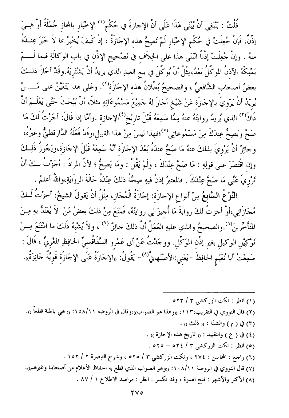 النَّوْعُ السَّابِعُ مِنْ أنواعِ الإجازَةِ: إجَازَةُ الْمُجَازِ، مِثْلُ أنْ يَقولَ الشيخُ: أجزْتُ لَكَ مُجَازَاتِي، أوْ أجزتُ لكَ روايةَ مَا أُجِيزَ لِي روايتُهُ، فَمَنَعَ مِنْ ذلكَ بعضُ مَنْ لاَ يُعْتَدُّ بهِ مِنَ المتَأَخِّرينَ (¬6). والصحيحُ والذي عليهِ العَمَلُ أنَّ ذلكَ جائِزٌ (¬7)، ولاَ يُشْبِهُ ذَلكَ ما امْتَنَعَ مِنْ تَوْكِيْلِ الوكيلِ بغيرِ إذْنِ الموَكِّلِ. ووجَدْتُ عَنْ أبي عَمْرٍو السَّفَاقُسِيِّ الحافِظِ المغْرِبيِّ، قَالَ: سَمِعْتُ أبا نُعَيْمٍ الحافِظَ -يَعْنِي: الأصْبَهانيَّ (¬8) - يَقُولُ: ((الإجَازَةُ عَلَى الإجَازَةِ قَوِيَّةٌ جَائِزَةٌ)).
