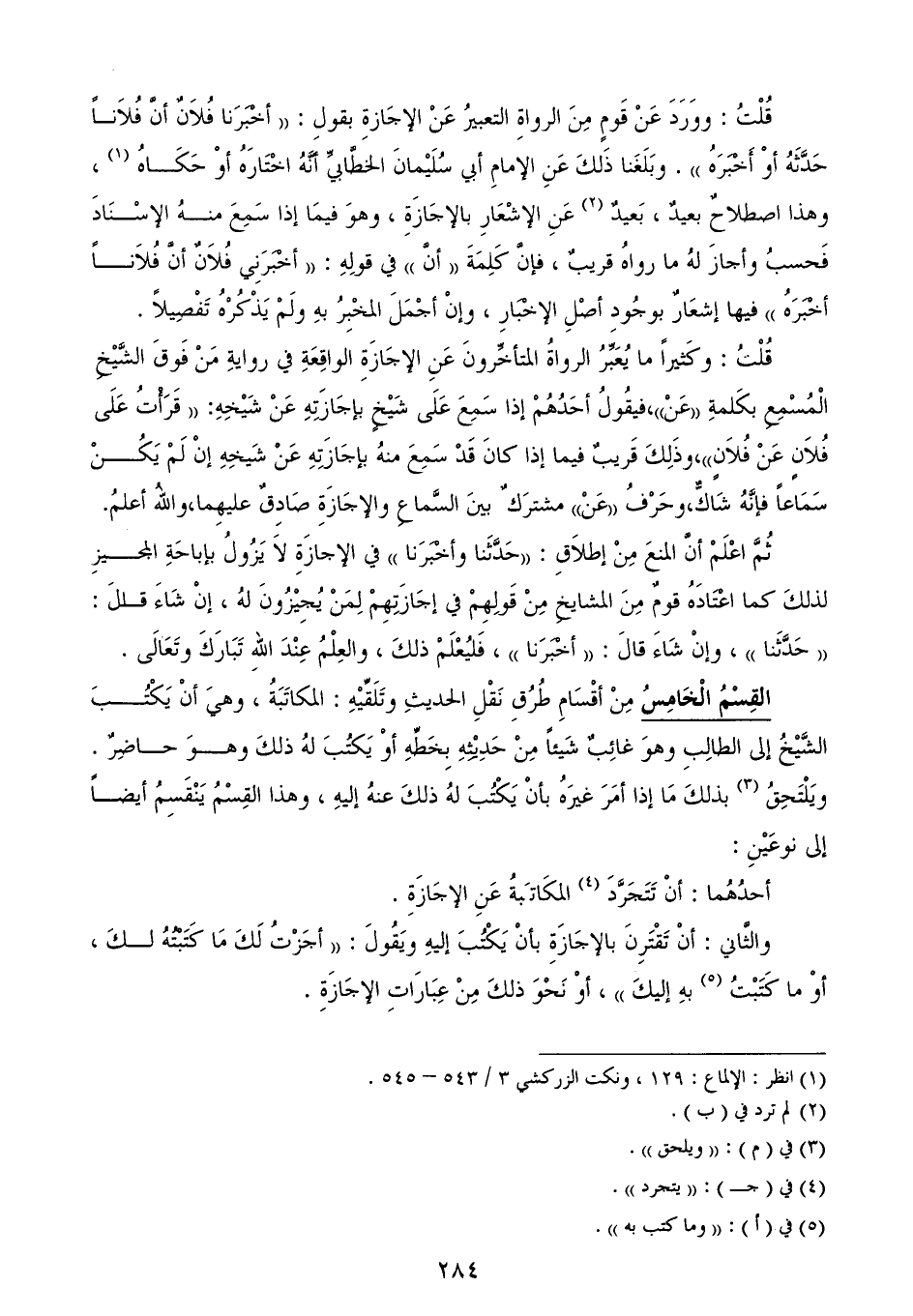 القِسْمُ الْخَامِسُ مِنْ أقْسَامِ طُرُقِ نَقْلِ الحديثِ وتَلَقِّيْهِ: المكاتَبَةُ، وهيَ أنْ يَكْتُبَ الشَّيْخُ إلى الطالِبِ وهوَ غائِبٌ شَيئاً مِنْ حَدِيْثِهِ بِخَطِّهِ أوْ يَكتُبَ لهُ ذلكَ وهوَ حاضِرٌ. ويَلْتَحِقُ (¬3) بذلكَ مَا إذا أمَرَ غيرَهُ بأنْ يَكْتُبَ لهُ ذلكَ عنهُ إليهِ، وهذا القِسْمُ يَنْقَسِمُ أيضاً إلى نوعَيْنِ: