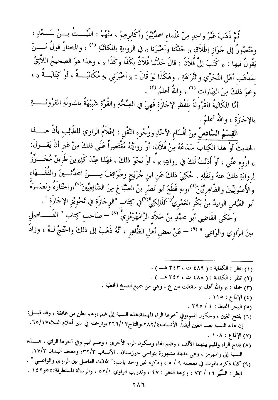 القِسْمُ السَّادِسُ مِنْ أقْسَامِ الأخْذِ ووُجُوهِ النَّقْلِ: إعْلاَمُ الراوي للطَّالِبِ بأنَّ هذا الحديثَ أوْ هذا الكِتابَ سَمَاعُهُ مِنْ فُلاَنٍ، أوْ روايَتُهُ مُقْتَصِراً عَلَى ذلكَ مِنْ غيرِ أنْ يَقولَ: ((ارْوِهِ عنِّي، أوْ أَذِنْتُ لَكَ في روايتِهِ))، أوْ نَحْوَ ذلكَ، فهَذا عِنْدَ كَثِيرينَ طَرِيقٌ مُجَوِّزٌ لِرِوايَةِ ذلكَ عنهُ ونَقْلِهِ. حُكِيَ ذلكَ عَنِ ابنِ جُرَيْجٍ وطَوَائِفَ مِنَ المحدِّثينَ والفُقَهَاءِ والأُصُولِيِّينَ والظَّاهِرِيِّيْنَ (¬4)، وبهِ قَطَعَ أبو نَصْرِ بنُ الصَّبَّاغِ مِنَ الشَّافِعِيِّينَ (¬5)، واخْتَارَهُ ونَصَرَهُ أبو العَبَّاسِ الوليدُ بنُ بَكْرٍ الغَمْرِيُّ (¬6) المَالِكِيُّ (¬7) في كِتَابِ "الوِجَازَةِ في تَجْوِيْزِ الإجَازَةِ ".