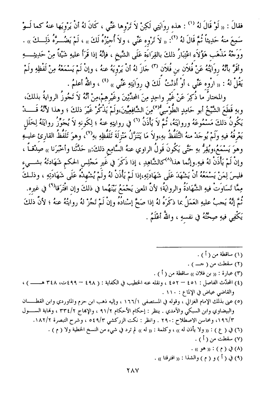 والمختارُ ما ذُكِرَ عَنْ غَيْرِ واحِدٍ مِنَ المحدِّثِينَ وغَيْرِهِمْ، مِنْ أنَّهُ لاَ تَجُوزُ الروايةُ بذلكَ، وبهِ قَطَعَ الشَّيْخُ أبو حَامِدٍ الطُّوْسِيُّ (¬5) مِنَ الشَّافِعِيِّينَ، ولَمْ يَذْكُرْ غَيْرَ ذلكَ؛ وهذا لأنَّهُ قَدْ يَكُونُ ذلكَ مَسْمُوعَهُ وروايَتَهُ، ثُمَّ لاَ يَأْذَنُ (¬6) في روايتِهِ عنهُ؛ لِكَونِهِ لاَ يُجَوِّزُ روايَتَهُ لِخَلَلٍ يَعْرِفُهُ فيهِ وَلَمْ يُوجَدْ منهُ التَّلَفُّظُ بهِ، ولاَ مَا يَتَنَزَّلُ مَنْزِلَةَ تَلَفُّظِهِ بهِ (¬7)، وهوَ تَلَفُّظُ القارِئِ عليهِ وهوَ يَسْمَعُ، ويُقِرُّ بهِ حَتَّى يَكُونَ قَولُ الراوي عنهُ السَّامِعِ ذلكَ: ((حَدَّثَنا وأخْبَرَنا)) صِدْقاً، وإنْ لَمْ يَأْذَنْ لهُ فيهِ. وإنَّما هذا (¬8) كالشَّاهِدِ، إذا ذَكَرَ في غَيرِ مَجْلِسِ الحكمِ شَهَادتَهُ بشيءٍ فليسَ لِمَنْ يَسْمَعُهُ أنْ يَشْهَدَ عَلَى شَهَادَتِهِ، إذا لَمْ يَأْذَنْ لهُ ولَمْ يُشْهِدْهُ عَلَى شَهَادَتِهِ، وذلكَ مِمَّا تَسَاوَتْ فيهِ الشَّهَادَةُ والروايَةُ؛ لأنَّ المعنى يَجْمَعُ بَيْنَهُما في ذلكَ وإنِ افْتَرَقا (¬9) في غيرِهِ.