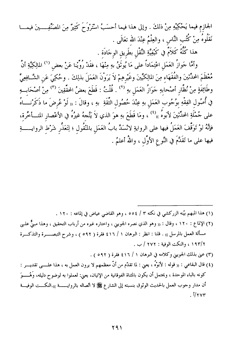 وأمَّا جَوازُ العَمَلِ اعْتِمَاداً على مَا يُوثَقُ بهِ مِنْهَا، فقَدْ رُوِّيْنا عَنْ بعضِ (¬1) المالِكِيَّةِ أنَّ مُعْظَمَ المحدِّثينَ والفُقَهَاءِ مِنَ المالِكيِّينَ وغَيْرِهِمْ لاَ يَرَوْنَ العَمَلَ بذلِكَ. وحُكِيَ عَنِ الشَّافِعِيِّ وطَائِفَةٍ مِنْ نُظَّارِ أصْحابِهِ جَوَازُ العَمَلِ بهِ (¬2). قُلْتُ: قَطَعَ بعضُ المحقِّقِينَ (¬3) مِنْ أصْحَابِهِ في أُصُولِ الفِقْهِ بِوُجُوبِ العَمَلِ بهِ عِنْدَ حُصُولِ الثِّقَةِ بهِ، وقالَ: ((لَوْ عُرِضَ ما ذَكَرْناهُ على جُمْلَةِ المحدِّثينَ لأبَوهُ)) (¬4)، ومَا قَطَعَ بهِ هوَ الذي لاَ يَتَّجِهُ غيرُهُ في الأعْصارِ المتأخِّرةِ، فإنَّهُ لوْ تَوَقَّفَ العَمَلُ فيها على الروايةِ لانْسَدَّ بابُ العَمَلِ بالمنْقُولِ؛ لِتَعَذُّرِ شَرْطِ الروايةِ فيها على ما تَقَدَّمَ في النَّوعِ الأوَّلِ، واللهُ أعلمُ.