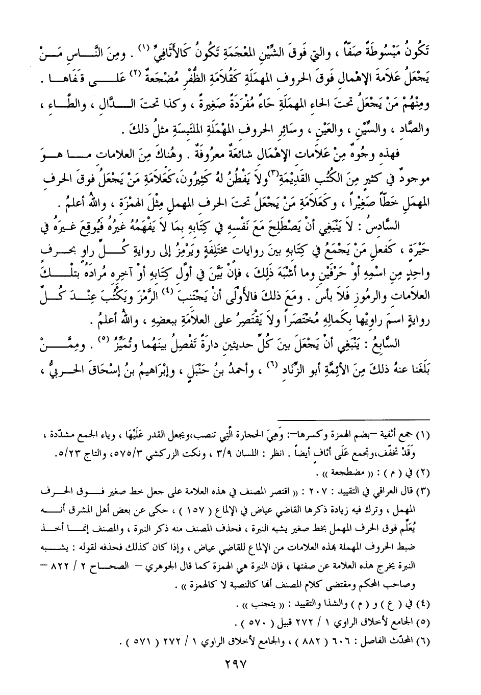 (¬3) قال العراقي في التقييد: 207: ((اقتصر المصنف في هذه العلامة على جعل خط صغير فوق الحرف المهمل، وترك فيه زيادة ذكرها القاضي عياض في الإلماع (157)، حكى عن بعض أهل المشرق أنه يُعَلِّم فوق الحرف المهمل بخط صغير يشبه النبرة، فحذف المصنف منه ذكر النبرة، والمصنف إنما أخذ ضبط الحروف المهملة بهذه العلامات من الإلماع للقاضي عياض، وإذا كان كذلك فحذفه لقوله: يشبه النبرة يخرج هذه العلامة عن صفتها، فإن النبرة هي الهمزة كما قال الجوهري - الصحاح 2/ 822 - وصاحب المحكم ومقتضى كلام المصنف أنها كالنصبة لا كالهمزة)).
