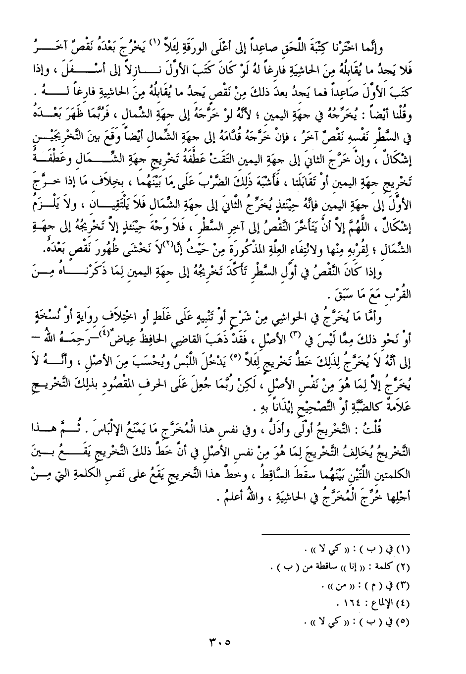 قُلْتُ: التَّخْريجُ أوْلَى وأدَلُّ، وفي نفسِ هذا الْمُخَرَّجِ مَا يَمْنَعُ الإلْبَاسَ. ثُمَّ هذا التَّخْريجُ يُخَالِفُ التَّخْريجَ لِمَا هُوَ مِنْ نفسِ الأصْلِ في أنَّ خَطَّ ذلكَ التَّخْريجِ يَقَعُ بينَ الكلمتينِ اللَّتَيْنِ بَيْنَهُما سقَطَ السَّاقِطُ، وخطَّ هذا التَّخريجِ يَقَعُ على نَفسِ الكلمةِ التي مِنْ أجْلِها خُرِّجَ الْمُخَرَّجُ في الحاشِيَةِ، واللهُ أعلمُ.