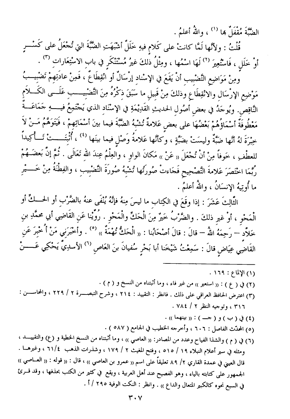 ومِنْ مَوَاضِعِ التَّضْبِيبِ أنْ يَقَعَ في الإسْنادِ إرْسَالٌ أو انْقِطَاعٌ، فَمِنْ عادَتِهِمْ تَضْبِيبُ مَوْضِعِ الإرْسَالِ والانْقِطَاعِ وذلكَ مِنْ قَبِيلِ ما سَبَقَ ذِكْرُهُ مِنَ التَّضْبِيبِ عَلَى الكَلاَمِ النَّاقِصِ. ويُوجَدُ في بعضِ أصُولِ الحديثِ القَدِيْمَةِ في الإسْنَادِ الذي يَجْتَمِعُ فيهِ جَمَاعَةٌ مَعْطُوفَةٌ أسْمَاؤُهُمْ بَعْضُهَا على بعضٍ عَلامةٌ تُشْبِهُ الضَّبَّةَ فيما بينَ أسْمَائِهِمْ، فَيَتَوَهَّمُ مَنْ لاَ خِبْرَةَ لهُ أنَّها ضَبَّةٌ وليسَتْ بضَبَّةٍ، وكأنَّها عَلامةُ وَصْلٍ فيما بينَها (¬4)، أُثْبِتَتْ تَأْكِيداً للعطْفِ، خَوفاً مِنْ أنْ تُجْعَلَ ((عَنْ)) مَكانَ الواوِ، والعِلْمُ عِندَ اللهِ تَعَالَى. ثُمَّ إنَّ بَعضَهُمْ رُبَّمَا اخْتَصَرَ عَلامةَ التَّصْحِيحِ فَجَاءتْ صُورَتُها تُشْبِهُ صُورَةَ التَّضْبِيبِ، والفِطْنَةُ مِنْ خَيْرِ ما أُوتِيهُ الإنسَانُ، واللهُ أعلمُ.
