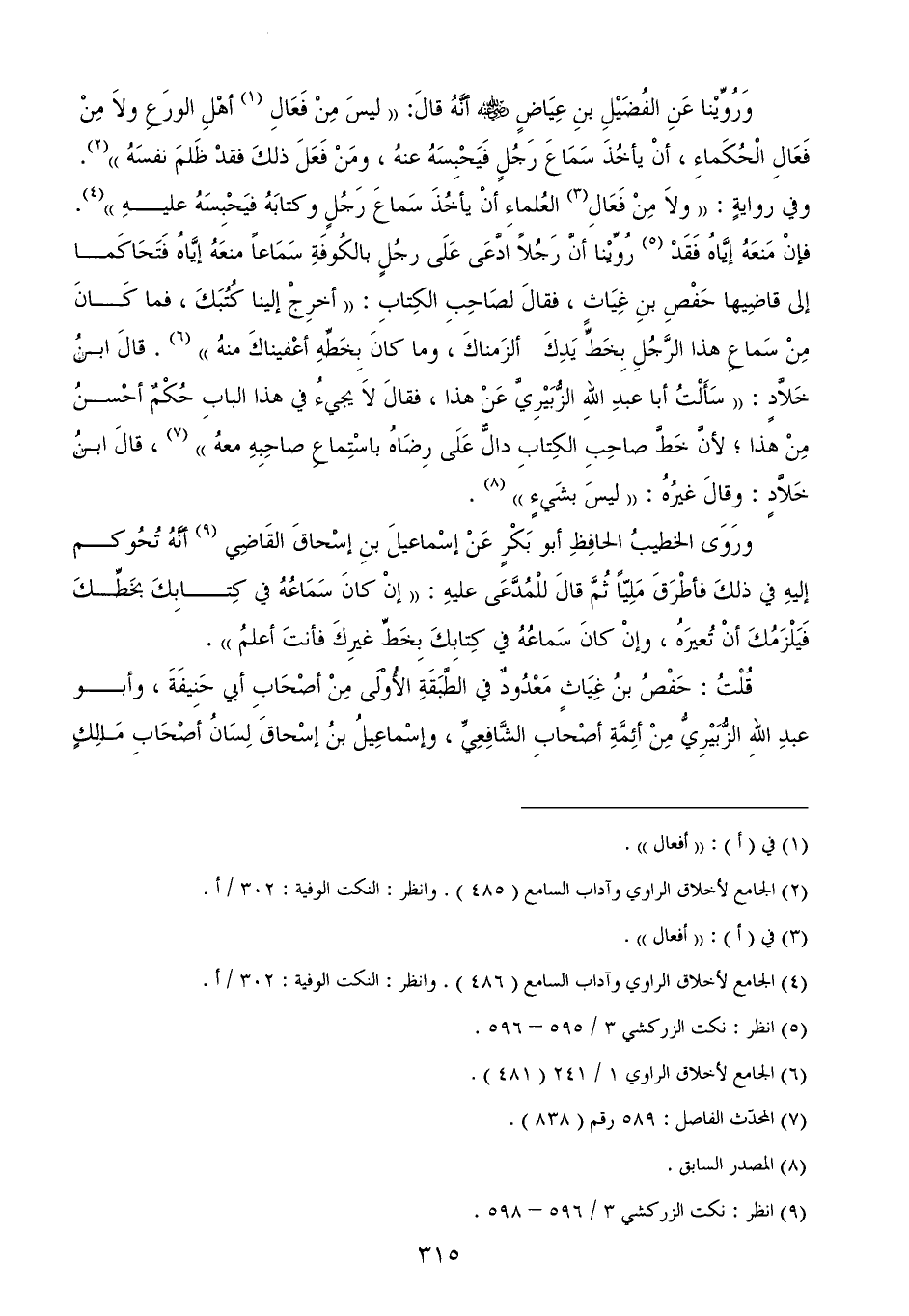 وَرُوِّيْنا عَنِ الفُضَيْلِ بنِ عِيَاضٍ - رضي الله عنه - أنَّهُ قالَ: ((ليسَ مِنْ فَعَالِ (¬1) أهْلِ الورَعِ ولاَ مِنْ فَعَالِ الْحُكَماءِ، أنْ يأخُذَ سَمَاعَ رَجُلٍ فَيَحْبِسَهُ عنهُ، ومَنْ فَعَلَ ذلكَ فقدْ ظَلمَ نفسَهُ)) (¬2). وفي روايةٍ: ((ولاَ مِنْ فَعَالِ (¬3) العُلماءِ أنْ يأخُذَ سَماعَ رَجُلٍ وكتابَهُ فيَحْبِسَهُ عليهِ)) (¬4). فإنْ مَنعَهُ إيَّاهُ فَقَدْ (¬5) رُوِّيْنا أنَّ رَجُلاً ادَّعَى عَلَى رجُلٍ بالكُوفَةِ سَمَاعاً منعَهُ إيَّاهُ فَتَحَاكَما إلى قاضِيها حَفْصِ بنِ غِيَاثٍ، فقالَ لصَاحِبِ الكِتابِ: ((أخرِجْ إلينا كُتُبَكَ، فما كَانَ مِنْ سَماعِ هذا الرَّجُلِ بِخَطِّ يَدِكَ ألزَمناكَ، وما كانَ بِخَطِّهِ أعْفيناكَ منهُ)) (¬6). قالَ ابنُ خَلاَّدٍ: ((سَأَلْتُ أبا عبدِ اللهِ الزُّبَيْرِيَّ عَنْ هذا، فقالَ لاَ يجيءُ في هذا البابِ حُكْمٌ أحْسنُ مِنْ هذا؛ لأنَّ خَطَّ صاحِبِ الكِتابِ دالٌّ عَلَى رِضَاهُ باسْتِماعِ صاحِبِهِ معهُ)) (¬7)، قالَ ابنُ خَلاَّدٍ: وقالَ غيرُهُ: ((ليسَ بشَيءٍ)) (¬8).