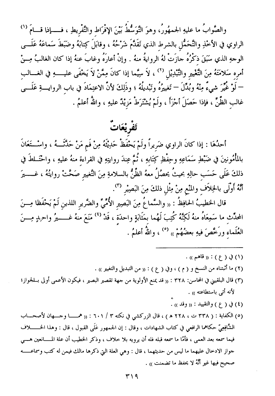 (¬5) الكفاية: (338 ت، 228 هـ)، قال الزركشي في نكته 3/ 601: ((هما وجهان لأصحاب الشَّافِعِيّ حكاهما الرافعي في كتاب الشهادات، وقال: إن الجمهور عَلَى القبول، قال: وهذا الخلاف فيما سمعه بعد العمى، فأمّا ما سمعه قبله فله أن يرويه بلا خلاف، وذكر الخطيب أن علة المانعين هي جواز الادخال عليهما ما ليس من حديثهما، قال: وهي العلة التي ذكرها مالك فيمن له كتب وسماعه صحيح فيها غير أنَّهُ لا يحفظ ما تضمنت)).