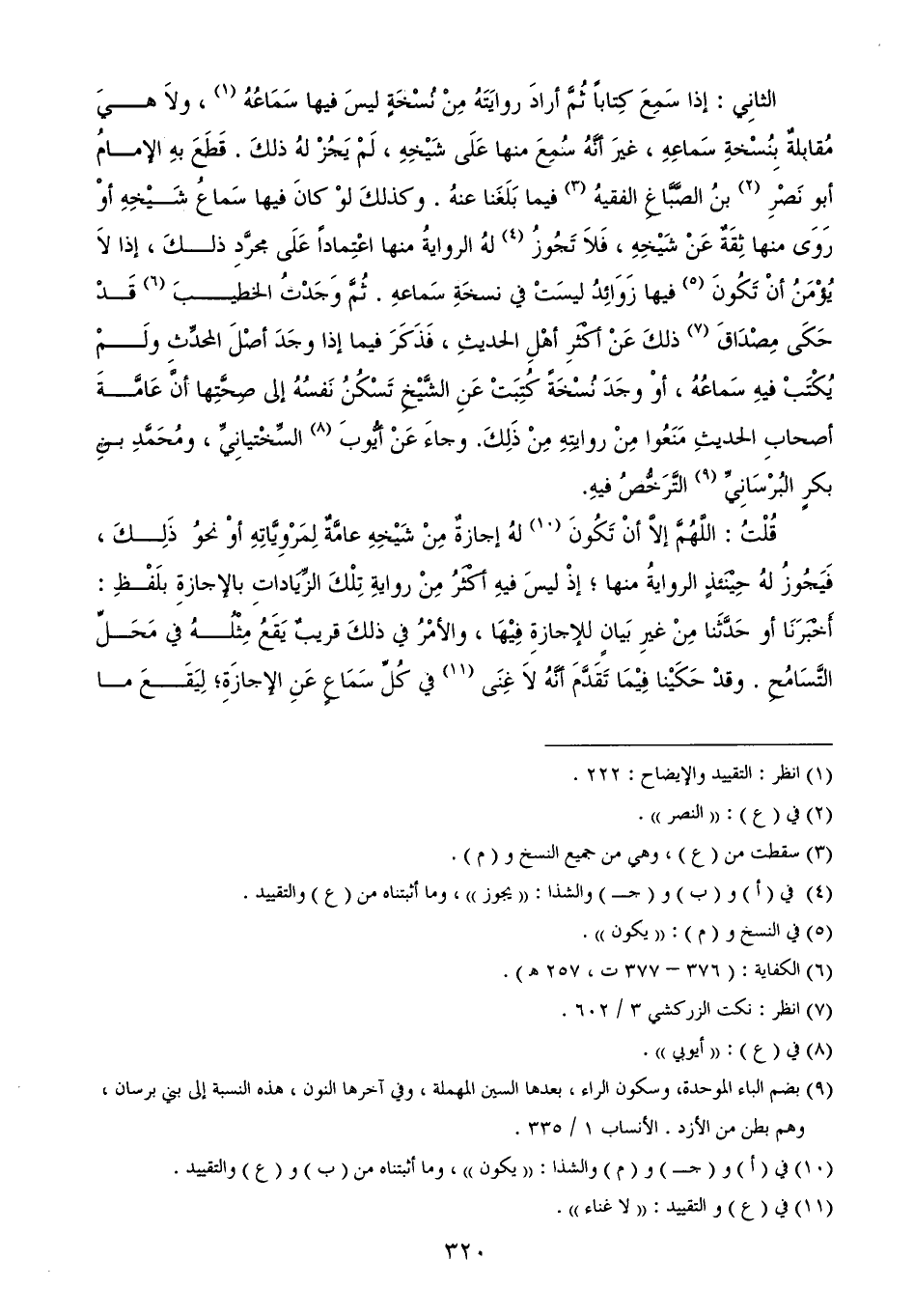 الثانِي: إذا سَمِعَ كِتاباً ثُمَّ أرادَ روايَتَهُ مِنْ نُسْخَةٍ ليسَ فيها سَمَاعُهُ (¬1)، ولاَ هيَ مُقابلةٌ بِنُسْخةِ سَماعِهِ، غيرَ أنَّهُ سُمِعَ منها عَلَى شَيْخِهِ، لَمْ يَجُزْ لهُ ذلكَ. قَطَعَ بهِ الإمامُ أبو نَصْرِ (¬2) بنُ الصَّبَّاغِ الفقيهُ (¬3) فيما بَلَغَنا عنهُ. وكذلكَ لوْ كانَ فيها سَماعُ شَيْخِهِ أوْ رَوَى منها ثِقَةٌ عَنْ شَيْخِهِ، فَلاَ تَجُوزُ (¬4) لهُ الروايةُ منها اعْتِماداً عَلَى مجرَّدِ ذلكَ، إذا لاَ يُؤْمَنُ أنْ تَكُونَ (¬5) فيها زَوَائِدُ ليسَتْ في نسخَةِ سَماعهِ. ثُمَّ وَجَدْتُ الخطيبَ (¬6) قَدْ حَكَى مِصْدَاقَ (¬7) ذلكَ عَنْ أكْثَرِ أهْلِ الحديثِ، فَذَكَرَ فيما إذا وجَدَ أصْلَ المحدِّثِ ولَمْ يُكْتَبْ فيهِ سَماعُهُ، أوْ وجَدَ نُسْخَةً كُتِبَتْ عَنِ الشَّيْخِ تَسْكُنُ نَفسُهُ إلى صِحَّتِها أنَّ عَامَّةَ أصحابِ الحديثِ مَنَعُوا مِنْ روايتِهِ مِنْ ذَلِكَ. وجاءَ عَنْ أيُّوبَ (¬8) السِّخْتيانِيِّ، ومُحَمَّدِ بنِ بكرٍ البُرْسَانِيِّ (¬9) التَّرَخُّصُ فيهِ.