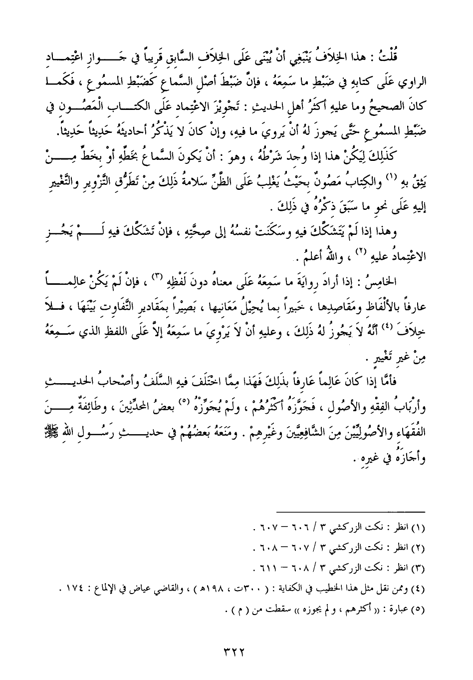 الخامِسُ: إذا أرادَ رِوايَةَ ما سَمِعَهُ عَلَى معناهُ دونَ لَفْظِهِ (¬3)، فإنْ لَمْ يَكُنْ عالِماً عارفاً بالألْفَاظِ ومَقَاصِدِها، خَبيراً بِما يُحِيْلُ مَعَانِيها، بَصِيْراً بِمَقَاديرِ التَّفَاوِتِ بَيْنَهَا، فلاَ خِلاَفَ (¬4) أنَّهُ لاَ يَجُوزُ لهُ ذَلِكَ، وعليهِ أنْ لاَ يَرْوِيَ ما سَمِعَهُ إلاَّ عَلَى اللفظِ الذي سَمِعَهُ مِنْ غيرِ تَغْييرٍ.