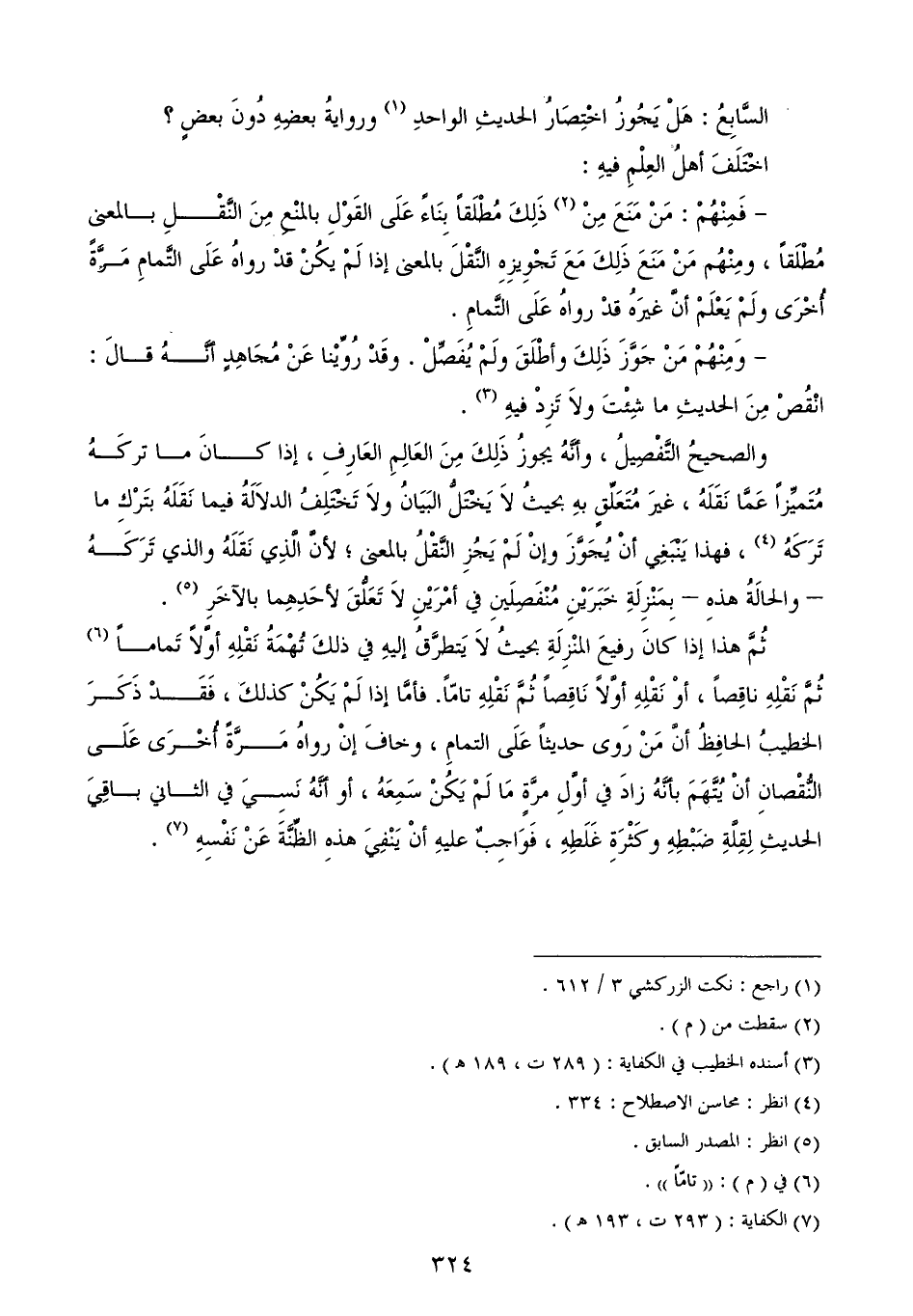 ثُمَّ هذا إذا كانَ رفيعَ المنْزِلَةِ بحيثُ لاَ يَتطرَّقُ إليهِ في ذلكَ تُهْمَةُ نَقْلِهِ أوَّلاً تَماماً (¬6) ثُمَّ نَقْلِهِ ناقِصاً، أوْ نَقْلِهِ أوَّلاً نَاقِصاً ثُمَّ نَقْلِهِ تامّاً. فأمَّا إذا لَمْ يَكُنْ كذلكَ، فَقَدْ ذَكَرَ الخطيبُ الحافِظُ أنَّ مَنْ رَوى حديثاً عَلَى التمامِ، وخافَ إنْ رواهُ مَرَّةً أُخْرَى عَلَى النُّقْصانِ أنْ يُتَّهَمَ بأنَّهُ زادَ في أوَّلِ مرَّةٍ مَا لَمْ يَكُنْ سَمِعَهُ، أو أنَّهُ نَسِيَ في الثاني باقِيَ الحديثِ لِقِلَّةِ ضَبْطِهِ وكَثْرَةِ غَلَطِهِ، فَوَاجِبٌ عليهِ أنْ يَنْفِيَ هذهِ الظِّنَّةَ عَنْ نَفْسِهِ (¬7).