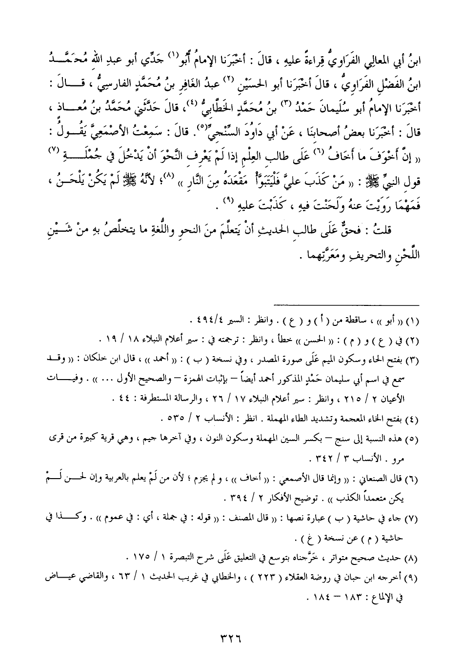 قلتُ: فحقٌّ عَلَى طالبِ الحديثِ أنْ يَتعلَّمَ منَ النحوِ واللُّغةِ ما يتخلَّصُ بهِ منْ شَيْنِ اللَّحْنِ والتحريفِ ومَعَرَّتِهما.