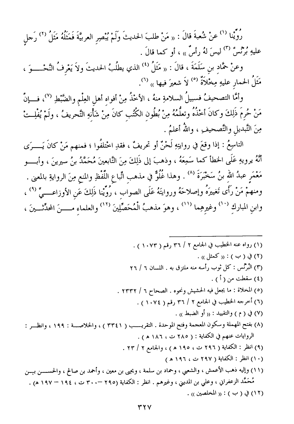 رُوِّيْنا (¬1) عنْ شُعبةَ قالَ: ((مَنْ طلبَ الحديثَ وَلَمْ يُبْصِرِ العربيَّةَ فَمَثَلُهُ مَثَلُ (¬2) رَجلٍ عليهِ بُرْنُسٌ (¬3) ليسَ لهُ رأسٌ))، أو كما قالَ.