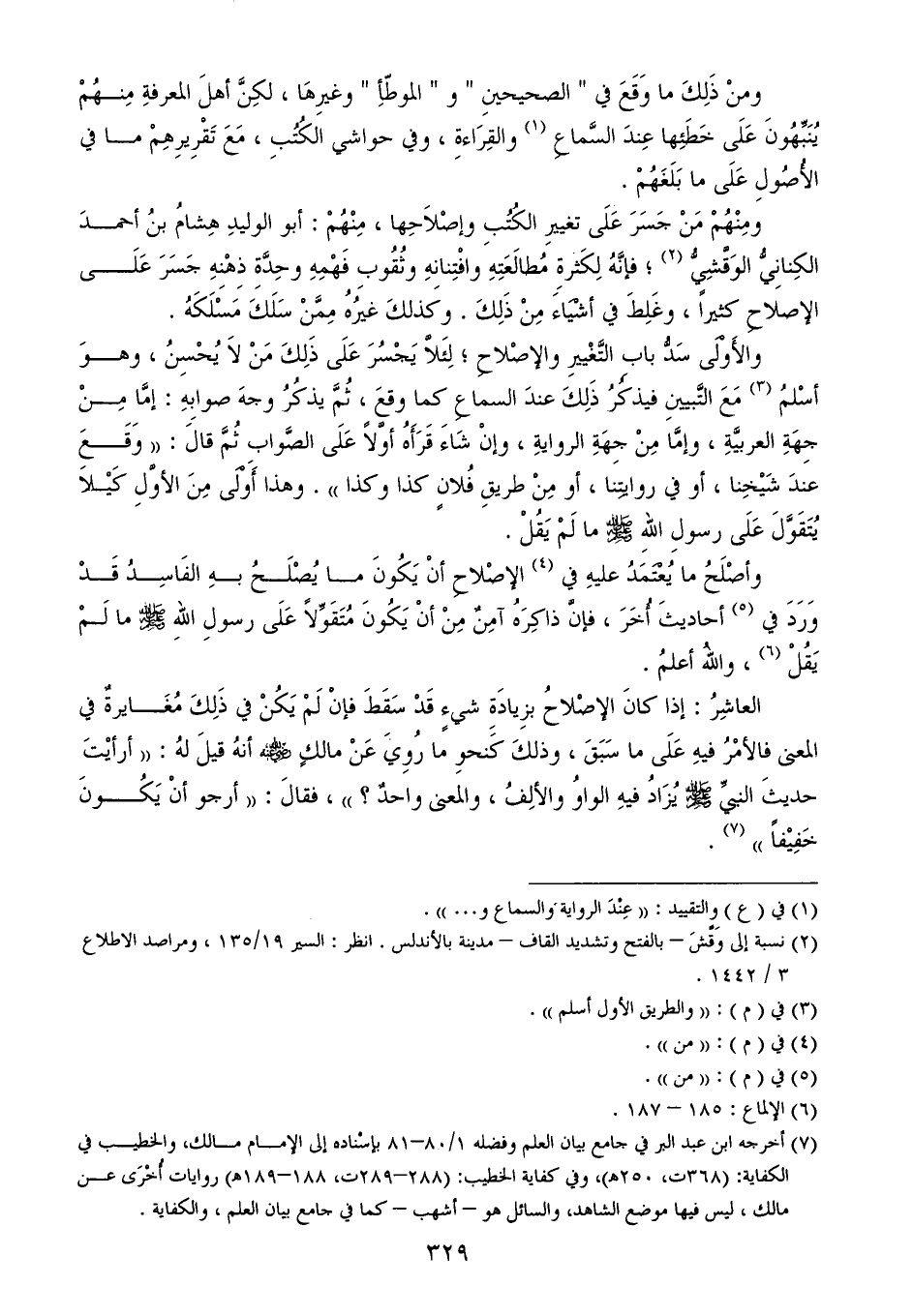 ومنْ ذَلِكَ ما وَقَعَ في " الصحيحينِ " و " الموطّأِ " وغيرِهَا، لكِنَّ أهلَ المعرفةِ مِنهُمْ يُنَبِّهُونَ عَلَى خَطَئِها عِندَ السَّماعِ (¬1) والقِرَاءةِ، وفي حواشي الكُتُبِ، مَعَ تَقْرِيرِهِمْ ما في الأُصُولِ عَلَى ما بَلَغَهُمْ.