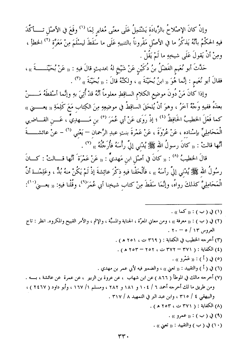 قالَ الخطيبُ (¬8): ((كانَ في أصْلِ ابنِ مَهديٍّ: ((عَنْ عَمْرَةَ أنَّها قالتْ: كانَ رسُولُ اللهِ - صلى الله عليه وسلم - يُدْنِي إليَّ رأسَهُ))، فأَلْحَقْنا فيهِ ذِكْرَ عائِشةَ إذْ لَمْ يَكُنْ منهُ بُدٌّ، وعَلِمْنا أنَّ الْمَحَامِلِيَّ كذلكَ رواهُ، وإنَّمَا سَقَطَ مِنْ كتابِ شيخِنا أبي عُمَرَ (¬9)، وقُلْنا فيهِ: ((يعني (¬10):